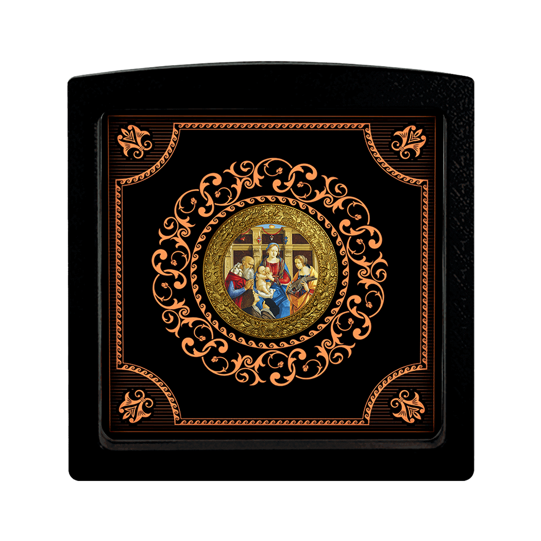 Numismat was issued in 2022 by the Republic of Cameroon as part of the prestigious Ave Maria series, devoted to sacred art. The inspiration for its creation was the work of the Italian Renaissance Balmer Michelangela di Pietro Membrino, also known as Michele di Ridolfo. His picture presents the Mother of God with the Children on the throne, alongside which Catherine Alexandrian stands, on the other side of the priest, and the Donor kneels in front of her, probably the Founder of the Field. These types of performances were popular in Italy in the 15th and 16th centuries, when the Aristocracy and clergy ordered works of art to emphasize their piety and social status.