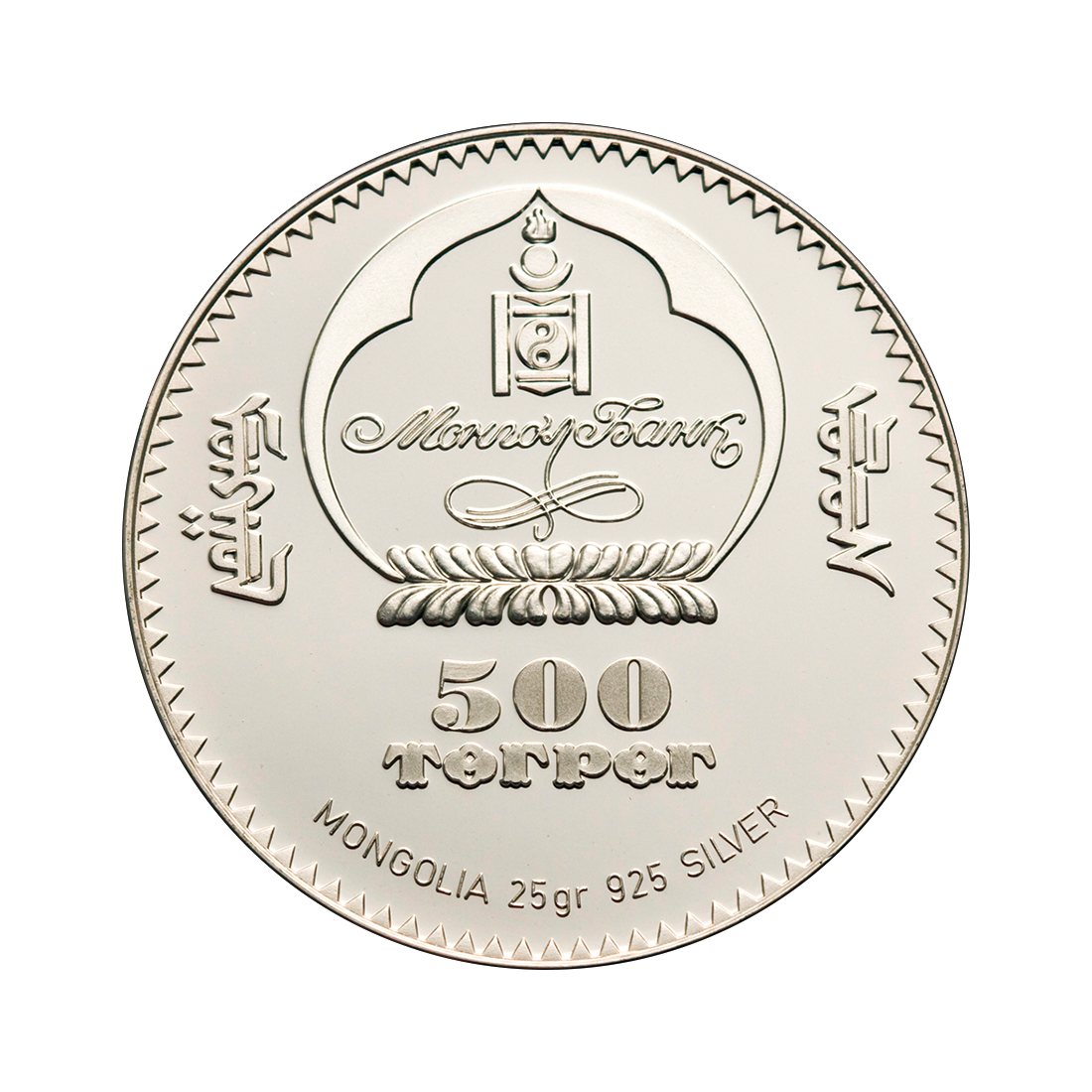 The obverse shows the emblem of the Bank of Mongolia, the denomination of the coin, and an inscription in traditional Mongolian script.