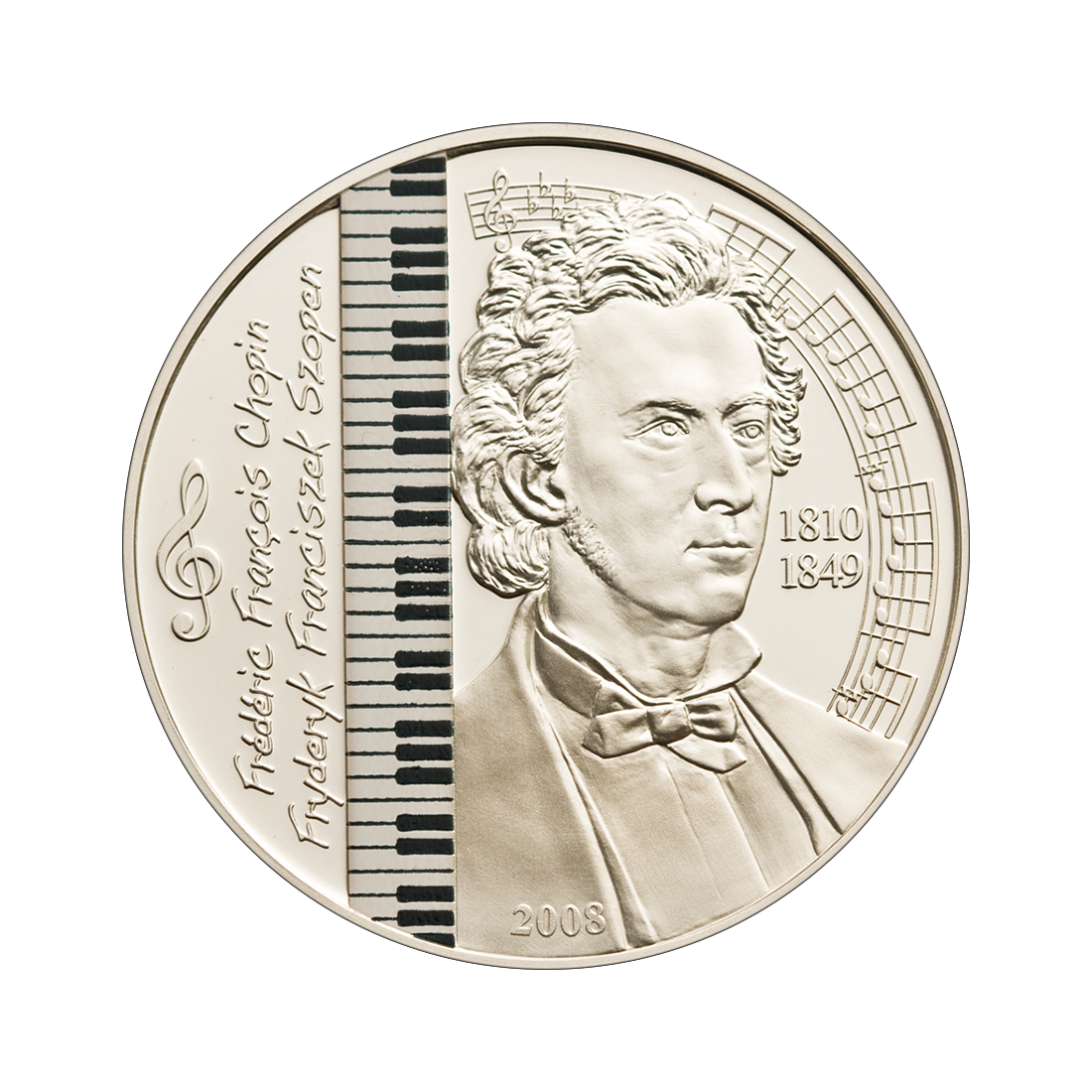 The reverse features a portrait of Frederic Chopin, with an engraved musical notation in the background. On the left side, there is a treble clef, the composer's name in Polish and French, and a piano keyboard.