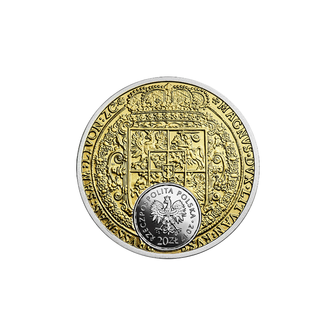 The obverse of the coin features the reverse of the original 100-ducat numismatic of Sigismund III Vasa with the image of the ruler, highlighted by selective gilding. The lower part features a stylized obverse of a contemporary 20-zloty coin, referring to current Polish circulation coins. The reverse, on the other hand, presents the obverse of the historical 100-ducat numismatic, also adorned with selective gilding, with a centrally placed image of the eagle established for the emblem of the Republic of Poland. At the bottom, along the rim, there is the inscription: "100 DUKATÓW ZYGMUNTA III".
