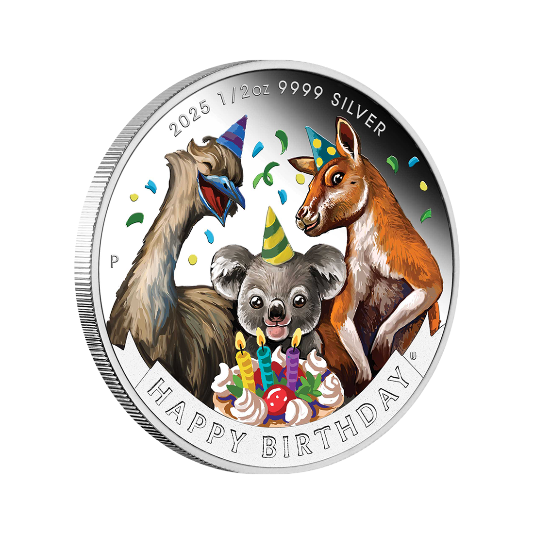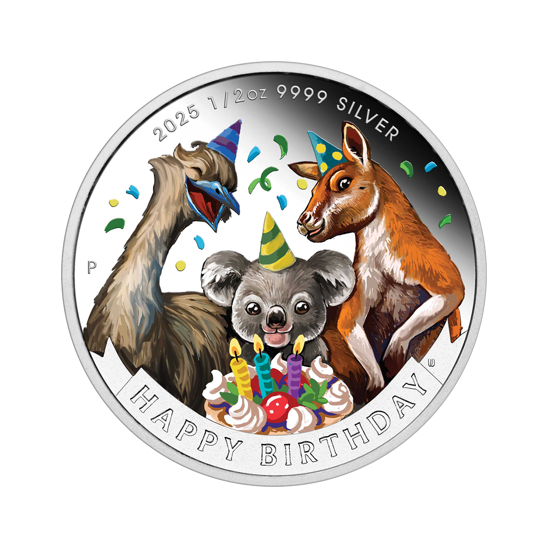 In 2025, the coin was minted in a 1/2 ounce silver version, featuring on the reverse colorful images of three animals characteristic of Australia: an emu, a koala, and a kangaroo, celebrating a birthday. The continuation of the series highlights the mint's commitment to creating high-quality commemorative coins that combine collectible value with an attractive design, perfect for a birthday gift.