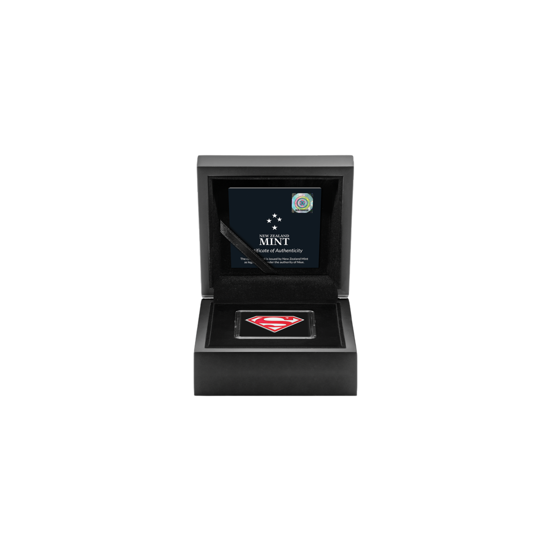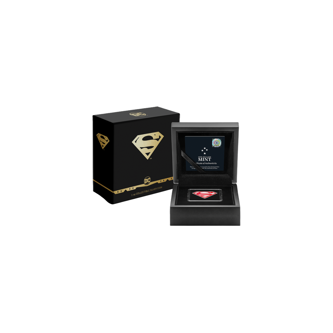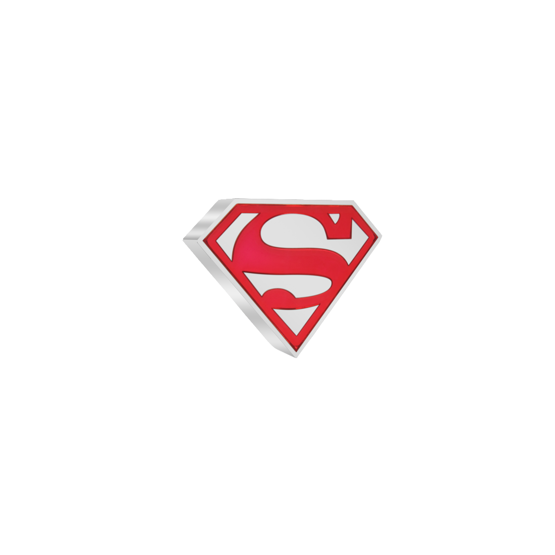 The reverse of the coin is a representation of Superman's shield. The characteristic letter "S" is highlighted in red, and the mirror finish makes the silver beautifully shimmer in the light.