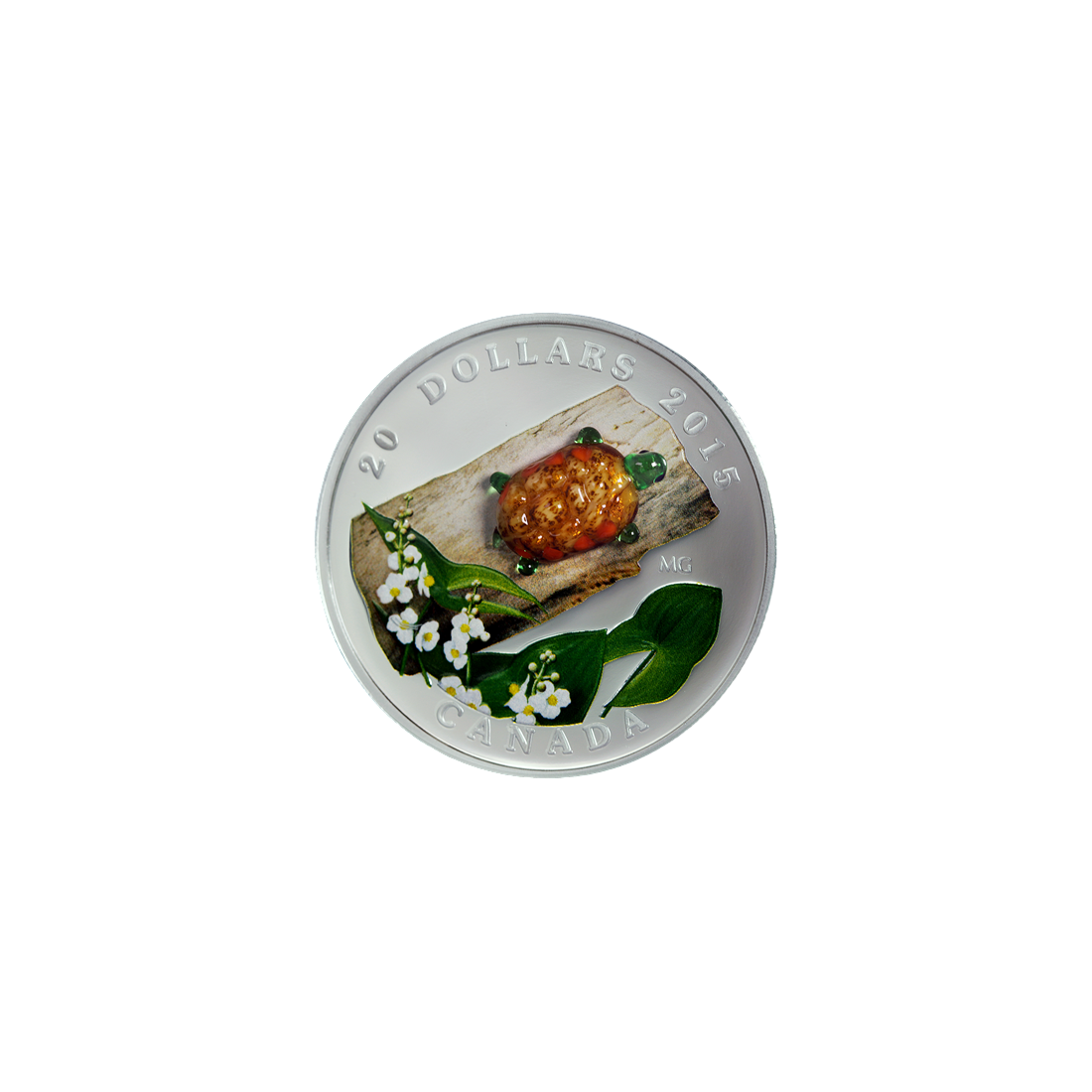 The silver coin "Venetian Glass Turtle with Broadleaf Arrowhead Flower" is a unique collector's item that combines the artistry of craftsmanship with investment value. Minted in 2015 by the Royal Canadian Mint, it is the fifth installment in a valued series that combines Canada's flora and fauna with elements of Venetian glass.