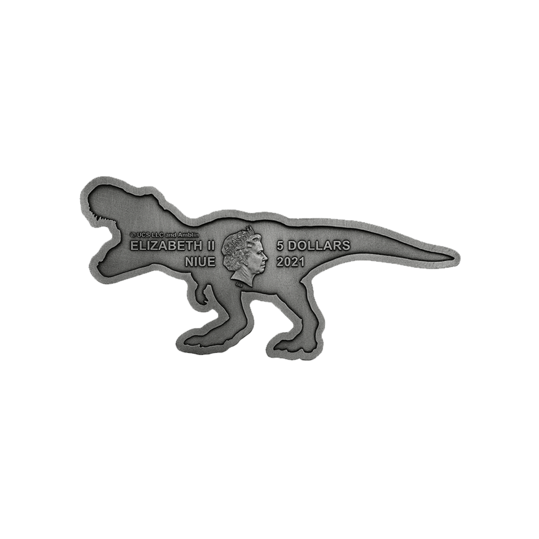 What makes this coin even more special is its extraordinary shape in the form of a Tyrannosaurus Rex. It is not only a collectible item but also a true work of art. The finishing detail is simply stunning, making the coin appear to be a real dinosaur that has returned from the past. The antique finish adds extra charm and historical character.