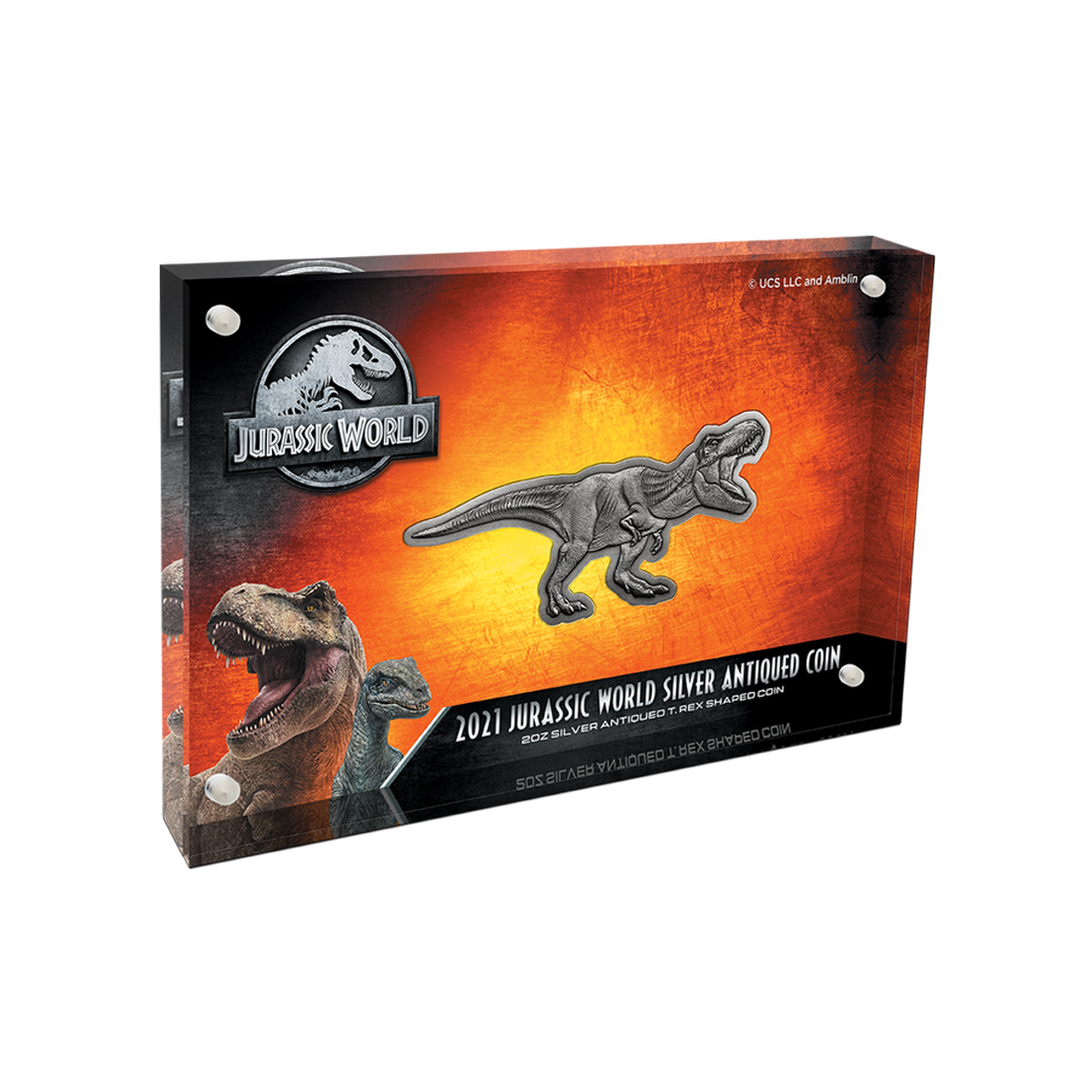 2022 2 oz Antique Niue Silver Jurassic World T-Rex Sign Shaped Coin - 24h Shipping! is a true treasure for dinosaur enthusiasts and fans of the Jurassic Park movie. This unique investment is not only visually stunning but also has the potential for value growth. Made from high-quality silver weighing two ounces, this coin will delight any collector and investor.