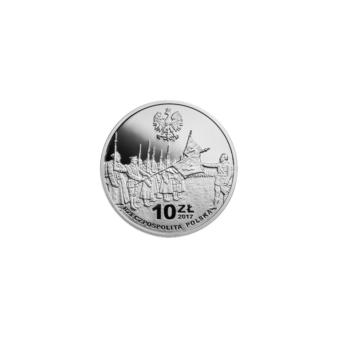 The obverse of the coin depicts the scene of the oath of the Polish Army in France, referring to events related to the Polish National Committee. At the top is the emblem of the Republic of Poland – an eagle with a crown, and below, in a semicircle along the bottom edge, the inscription "Rzeczpospolita Polska". Above is the denomination "10 ZŁ" and the year of issue "2017".