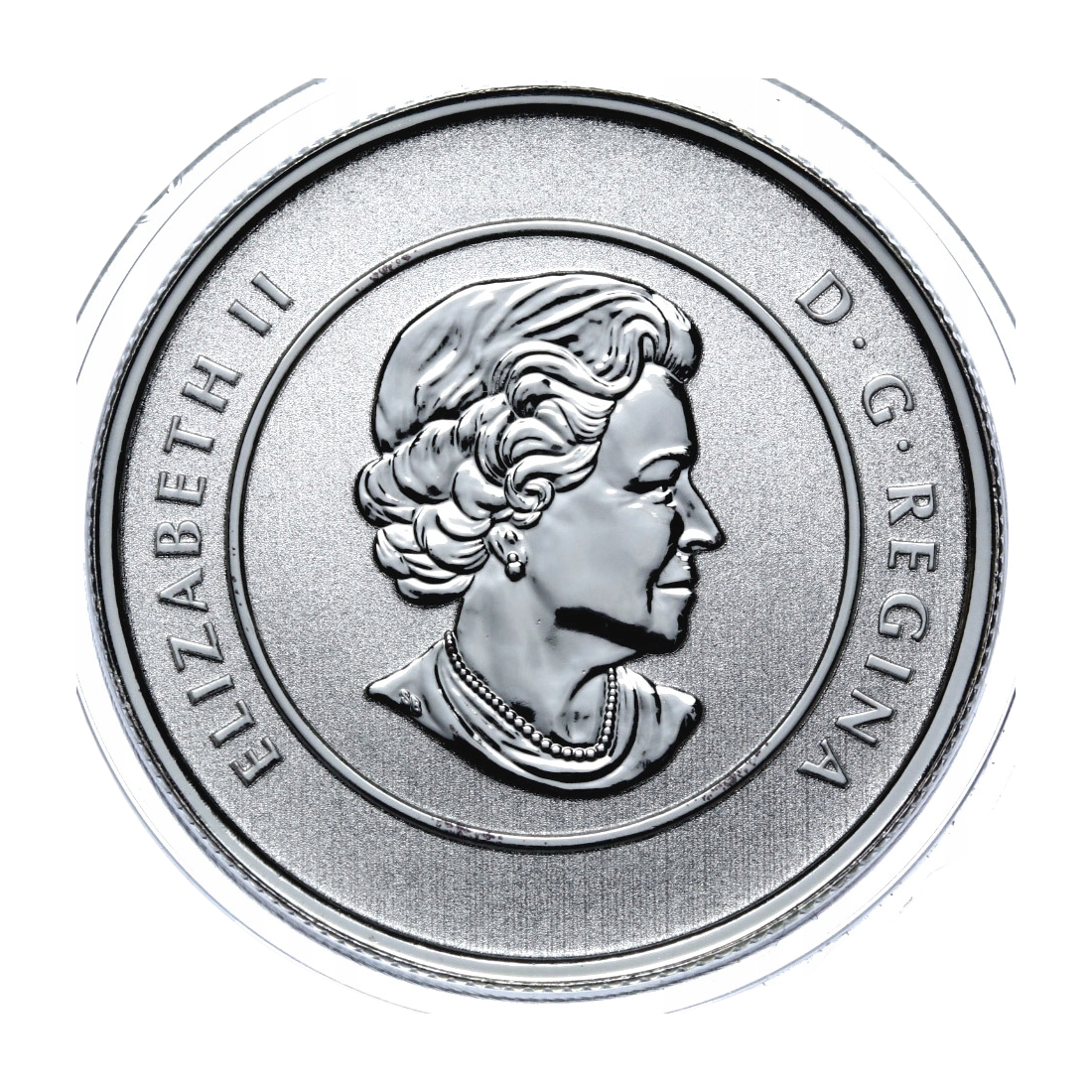 The reverse of the coin shows a single maple leaf – the national symbol of Canada – surrounded by inscriptions indicating the country of issue, silver fineness, and face value. The obverse features the classic portrait of Queen Elizabeth II, designed by Susanna Blunt, confirming the authenticity of the issue and its official status. The design is characterized by simplicity and elegance, while also paying tribute to Canadian identity and nature.