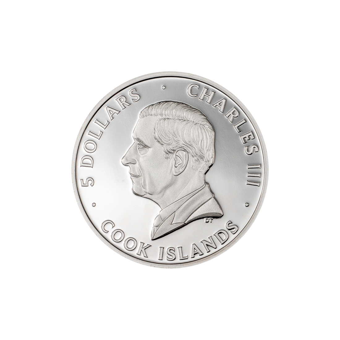 The obverse presents the profile of King Charles III, appearing in accordance with tradition on coins issued by the Cook Islands. The inscriptions "CHARLES III", "5 DOLLARS", and "COOK ISLANDS" confirm the coin's status as an official legal tender. A modern approach to classic design adds prestige and appeal in the eyes of collectors and investors.