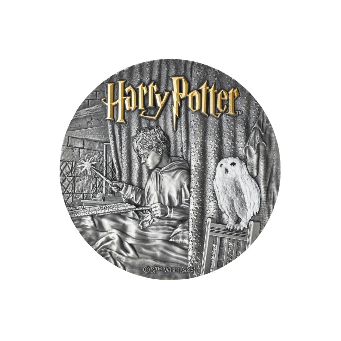 The reverse presents a scene in the Gryffindor dormitory – Harry with the Marauder's Map, a wand emitting a magical glow, and a realistic Hedwig, achieved through UV printing. The Hogwarts Castle in the background, reproduced with attention to architectural details, gives the coin a distinctive spatial presence. Additional gilding of the "Harry Potter" inscription adds prestige to the set.