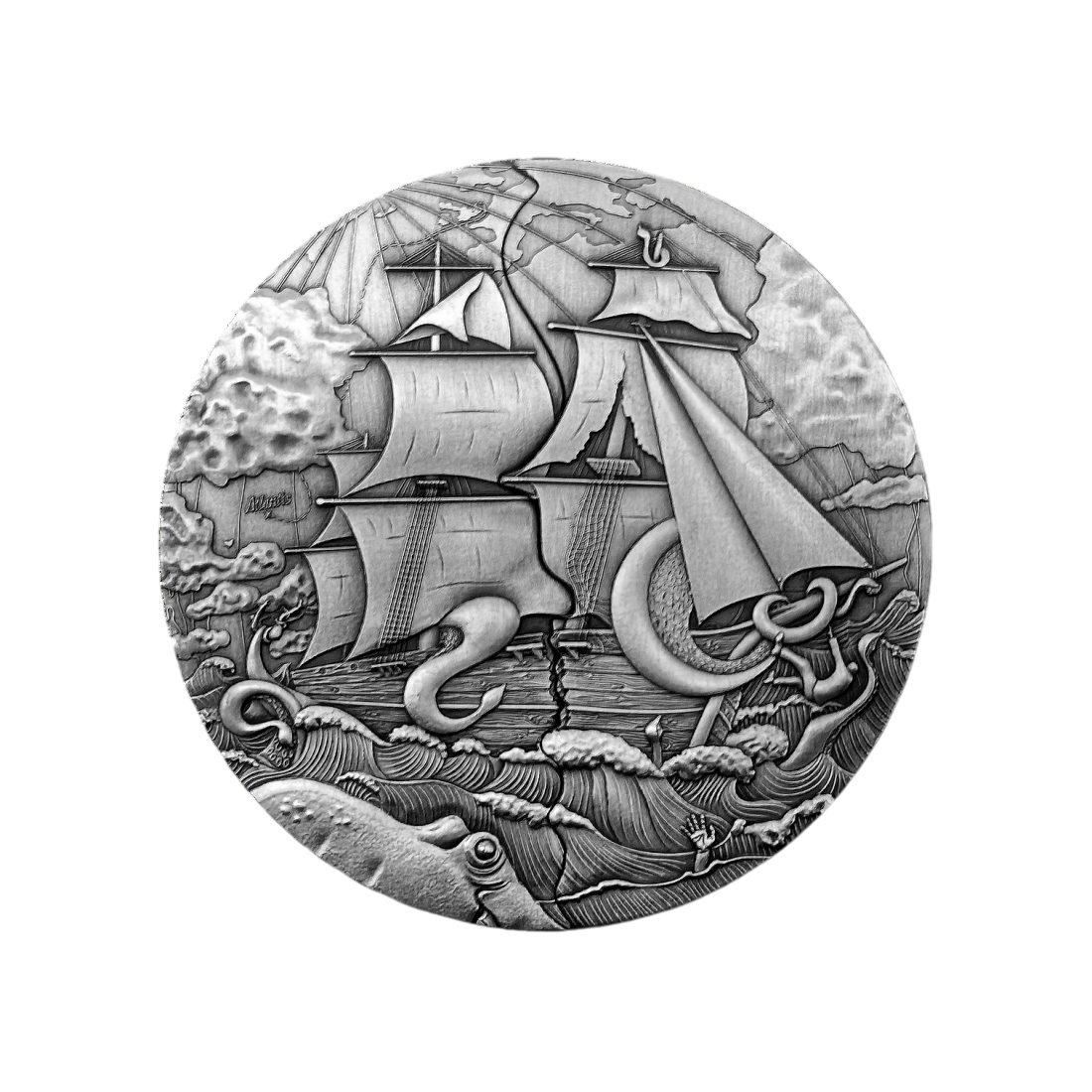 The main theme of the coin is Atlantis – one of the most mysterious and fascinating lost civilizations. The artistic depiction of the sunken city in high relief catches the eye and highlights the craftsmanship. The reverse of the coin shows characteristic architectural elements such as columns, temples, and ruins, symbolizing the lost culture shrouded in legend and mystery. It is an excellent proposal for collectors interested in history and mythology who want to have a unique specimen in their collection.