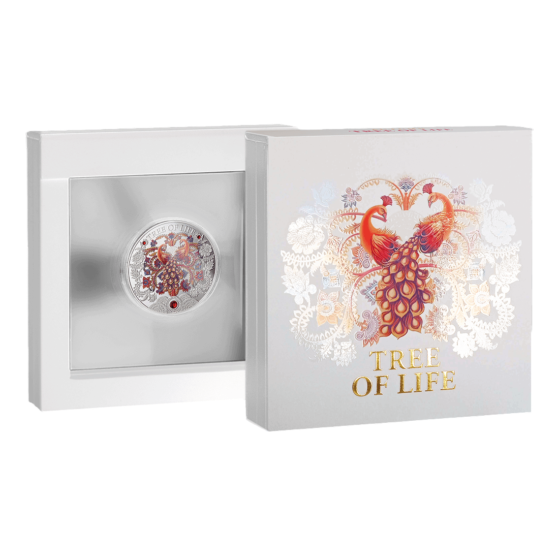 The design by MINT XXI impresses with an artistic combination of two peacocks intertwined with the crown of a tree, whose branches and leaves take on the warm colors of autumn – oranges, purples, and reds highlighted by advanced digital printing technology. A crystal addition embedded in the tree motif enhances the visual effect and prestige of the coin. The symbolism of the tree of life is based on the idea of rebirth, longevity, and harmony between the world of earth, sky, and spiritual life.