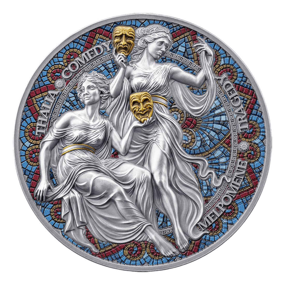 Costly detail and execution technique bring the product closer to a work of art. The reverse features tragic and comic masks in high relief, the background is adorned with digital printing reminiscent of ancient mosaics. The obverse is adorned with digitally gilded details, subtly highlighting the symbols of each muse. The "antique finish" quality gives a patinated, classic look that appeals to audiences who value history and mythology in numismatics.