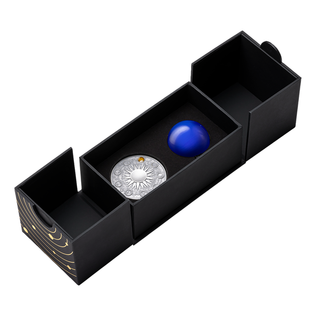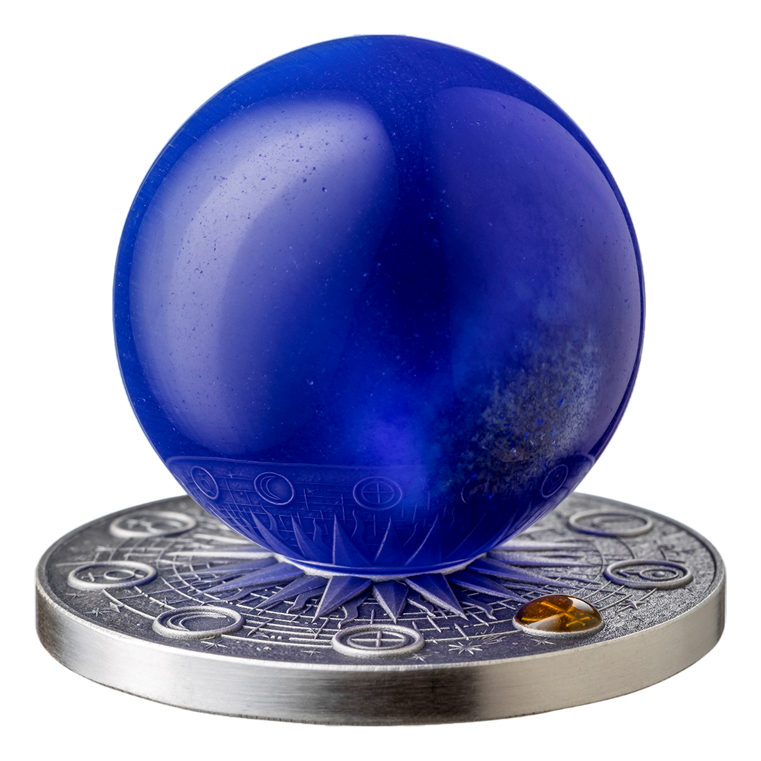 The reverse of the coin features a central three-dimensional image of Neptune made from a semi-precious stone – blue cat's eye, placed on a specially embossed map of the Solar System. This inlay captivates with a light effect reminiscent of a cat's pupil, giving the coin depth and a cosmic character. The background of the reverse is filled with precisely reproduced orbits and other planets.