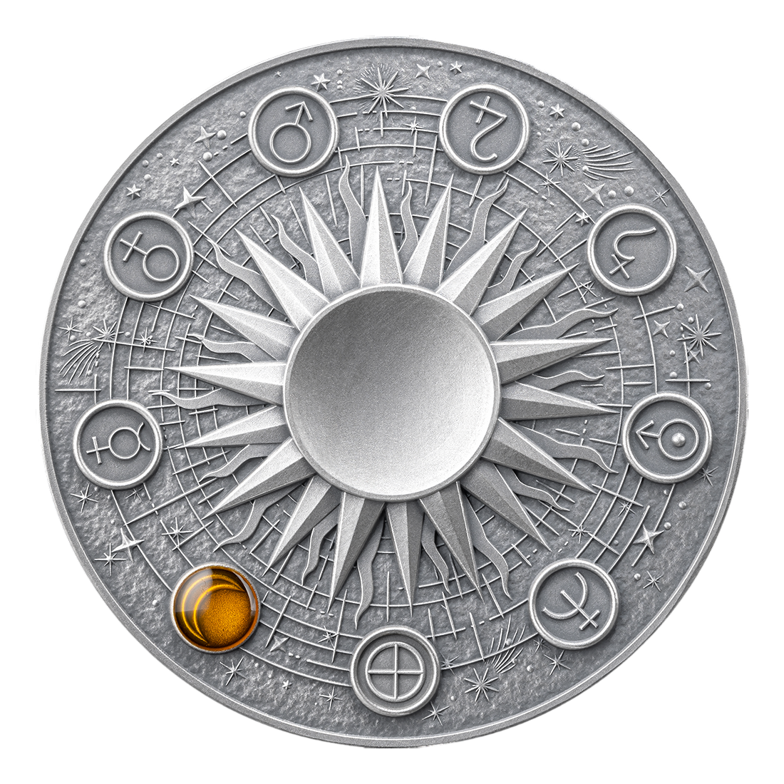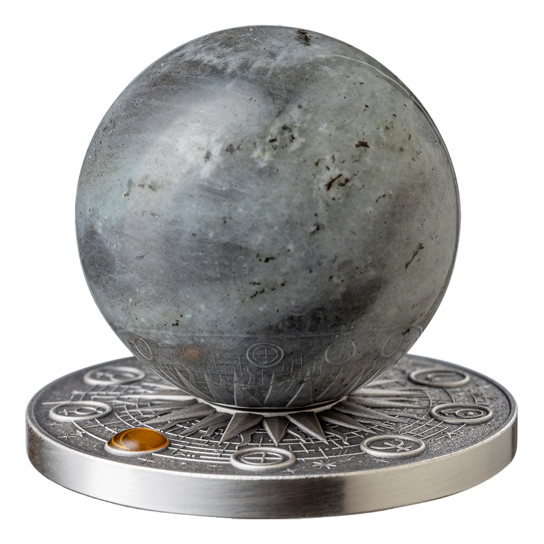 The reverse of the coin depicts the surface of the Moon in an extremely realistic view. Deep craters, grooves, and irregular structures are rendered using high relief, giving the whole an almost sculptural character. At the center of the composition is a natural stone – labradorite – subtly opalescent in cool shades, reminiscent of moonlight. Each piece is unique due to differences in the stone, ensuring no two coins are identical.