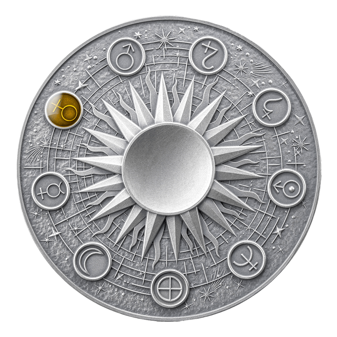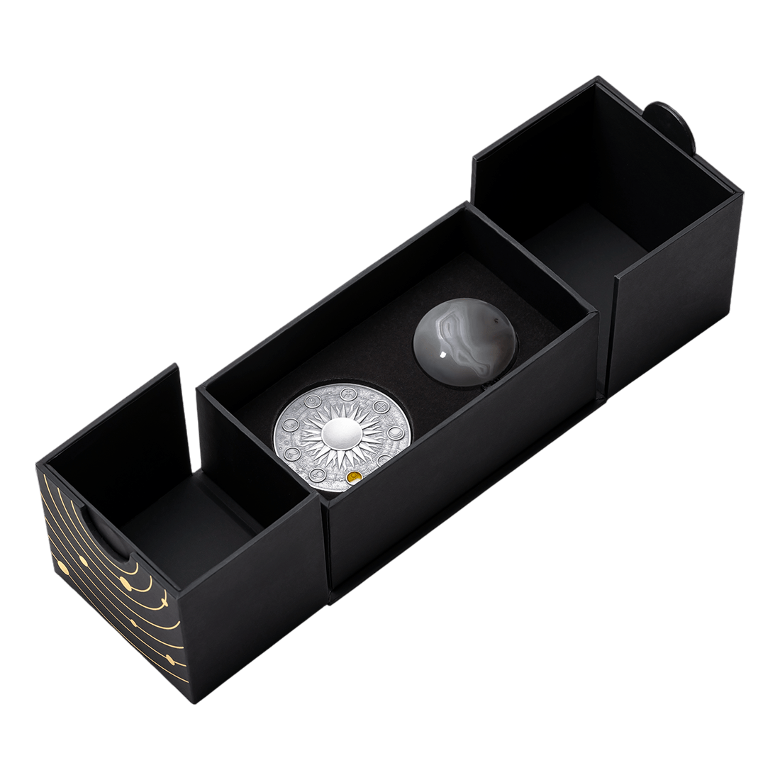This silver coin weighing 2 troy ounces and with a fineness of 0.999 was designed as part of the "Solar System" series. The reverse features the planet Venus in high relief, with an antiqued finish and subtle digital gilding on selected elements. An authentic agate sphere is included, symbolizing Venus's atmosphere and adding extraordinary character to the whole. The coin measures approximately 45 mm in diameter, highlighting the impressive design details.