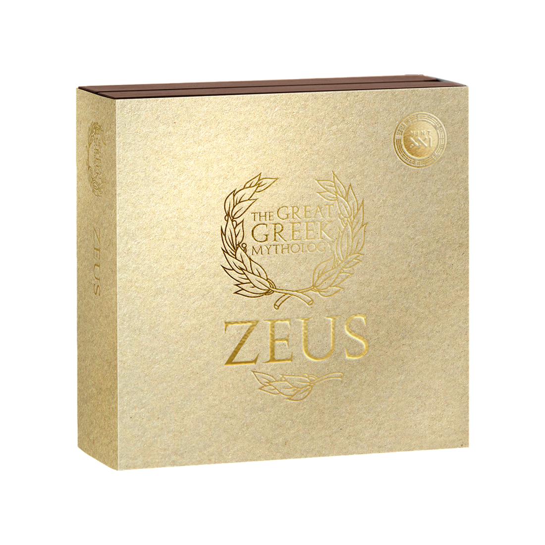 The obverse of the coin depicts Zeus sitting on a throne, holding a gilded scepter topped with an eagle's head – a symbol of power and divine protection. Beside him is also an eagle, a sign of his presence in mythology and vigilance over the world. Selective gilding highlights the most important elements of the composition, giving it additional brilliance and prestige. The high relief and antique finish provide depth and realism to the details, making the coin appear like a sculpture in metal.
