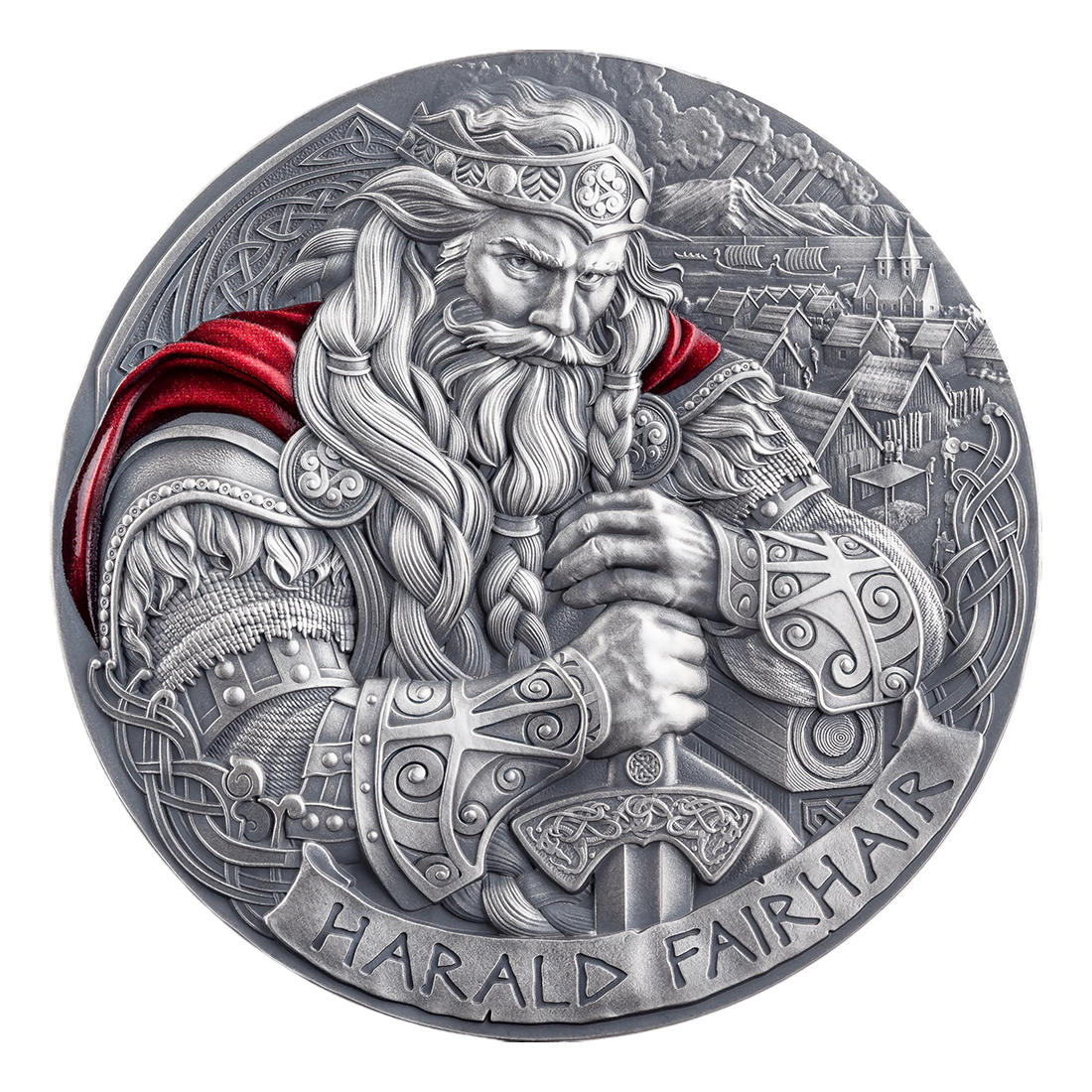 Harald Fairhair, considered the first king of a united Norway, symbolizes strength, leadership, and strategy. He appears on the reverse of the coin in an impressive form – with a flowing red cloak and sword in hand, emphasizing his authority and determination. The background with a Viking settlement evokes the historical turning point when the Nordic world began its united era.