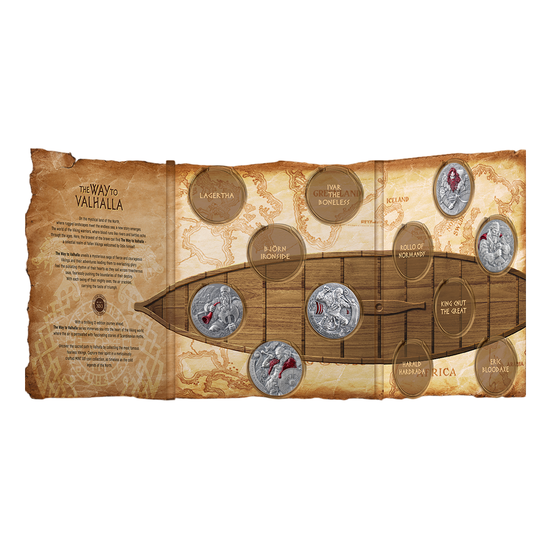 The coin was created in the original series Way to Valhalla, which narrates the story of Norse warriors and their mythological journey to eternal peace. Techniques such as high relief and selective digital printing give details like armor and cloak realistic depth and color intensity. The antique finish adds historical character, and the 50 mm diameter ensures appropriate thickness and solidity of numismatic presence.