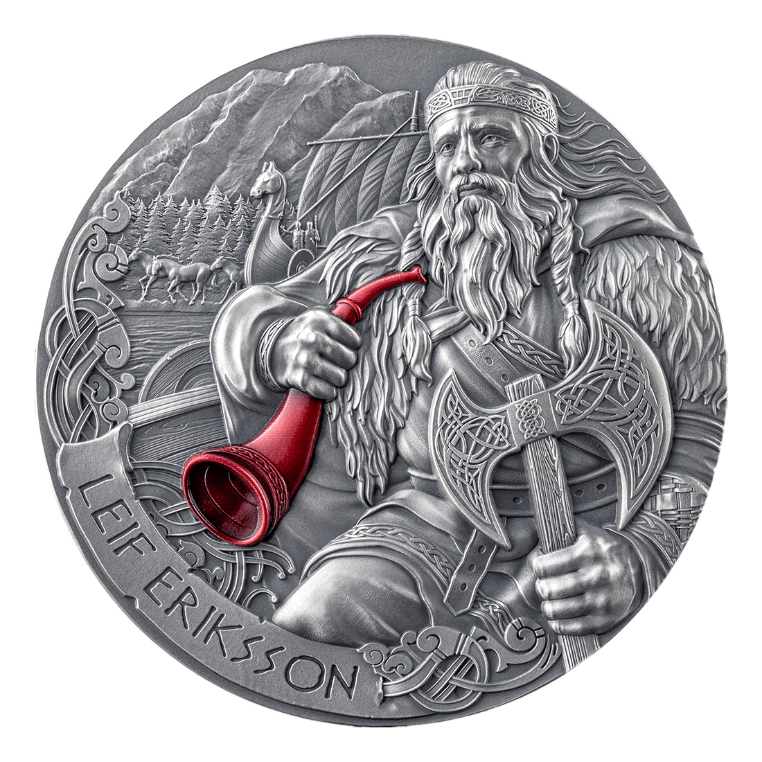 The coin's design was created with extraordinary attention to detail. Minted in High Relief technique combined with Antique Finish, it gives the coin exceptional depth and nobility. The reverse depicts Leif Eriksson standing on the bow of a ship, with an axe in one hand and a war horn in the other. The dynamic composition and color contrast – including the intense red of the horn – draw attention and emphasize the drama of the scene. The obverse of the coin presents a stylized image of a Norse warrior and inscriptions containing the denomination, issuer's name, and year of issue.