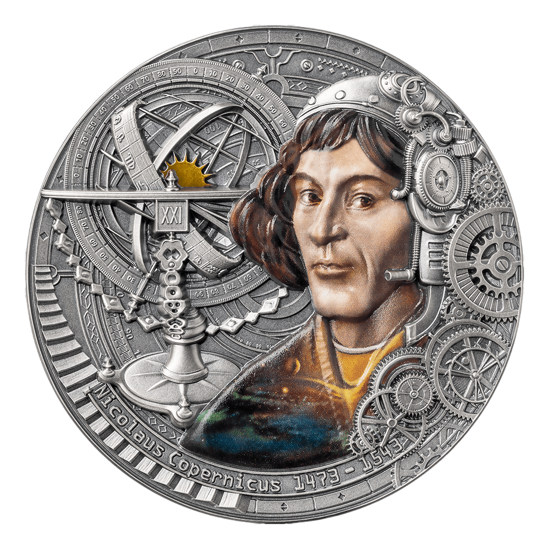 The coin's design combines a realistic portrait of Nicolaus Copernicus with elements of futuristic styling, referring to the groundbreaking significance of his discoveries for the development of science and civilization. The obverse features the image of the scholar with a characteristic gaze focused on the horizon of knowledge. The reverse shows a vision of the Solar System with geometric accents and digital printing, symbolizing a modern view of classical ideas. The use of selective gilding and antique finish further emphasizes the depth of the design.