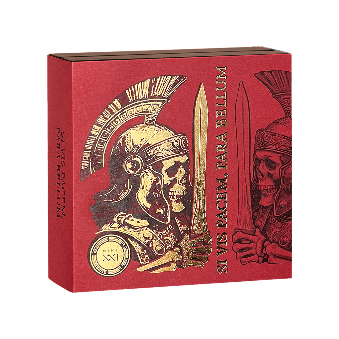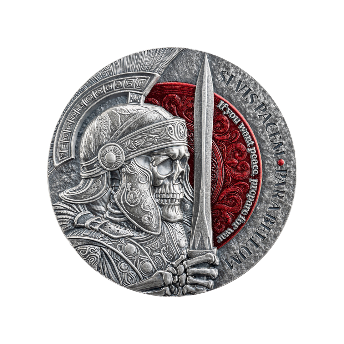 The 2025 Republic of Cameroon 2 oz Silver Si Vis Pacem, Para Bellum - 24h Shipping! is an extraordinary offer for investors who value not only the material's worth but also striking symbolism and limited series. The motif depicts a warrior – a Roman legionary with the timeless message: if you want peace, prepare for war. The background in intense shades of red emphasizes the drama and depth of the message.