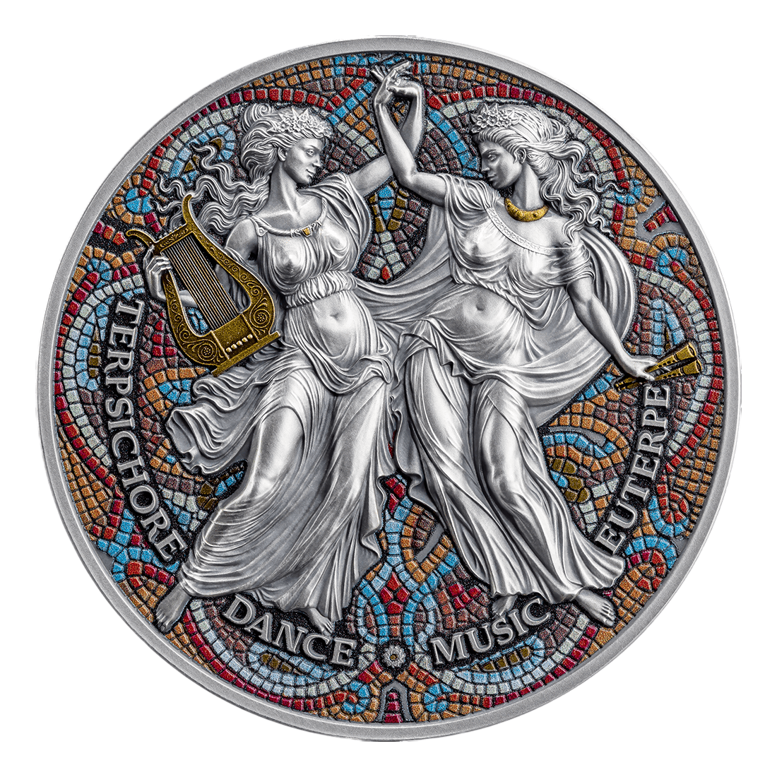 The coin is struck in antique high relief quality, which emphasizes the spatiality of details and gives the whole an impressive depth. The reverse depicts Terpsichore and Euterpe surrounded by stylized mosaics, enriched with digital printing and gilding elements, further accentuating elegance and historical atmosphere. The obverse shows a symbolic wheel divided into nine segments, dedicated to each of the muses, with a gilded sun at the central point.