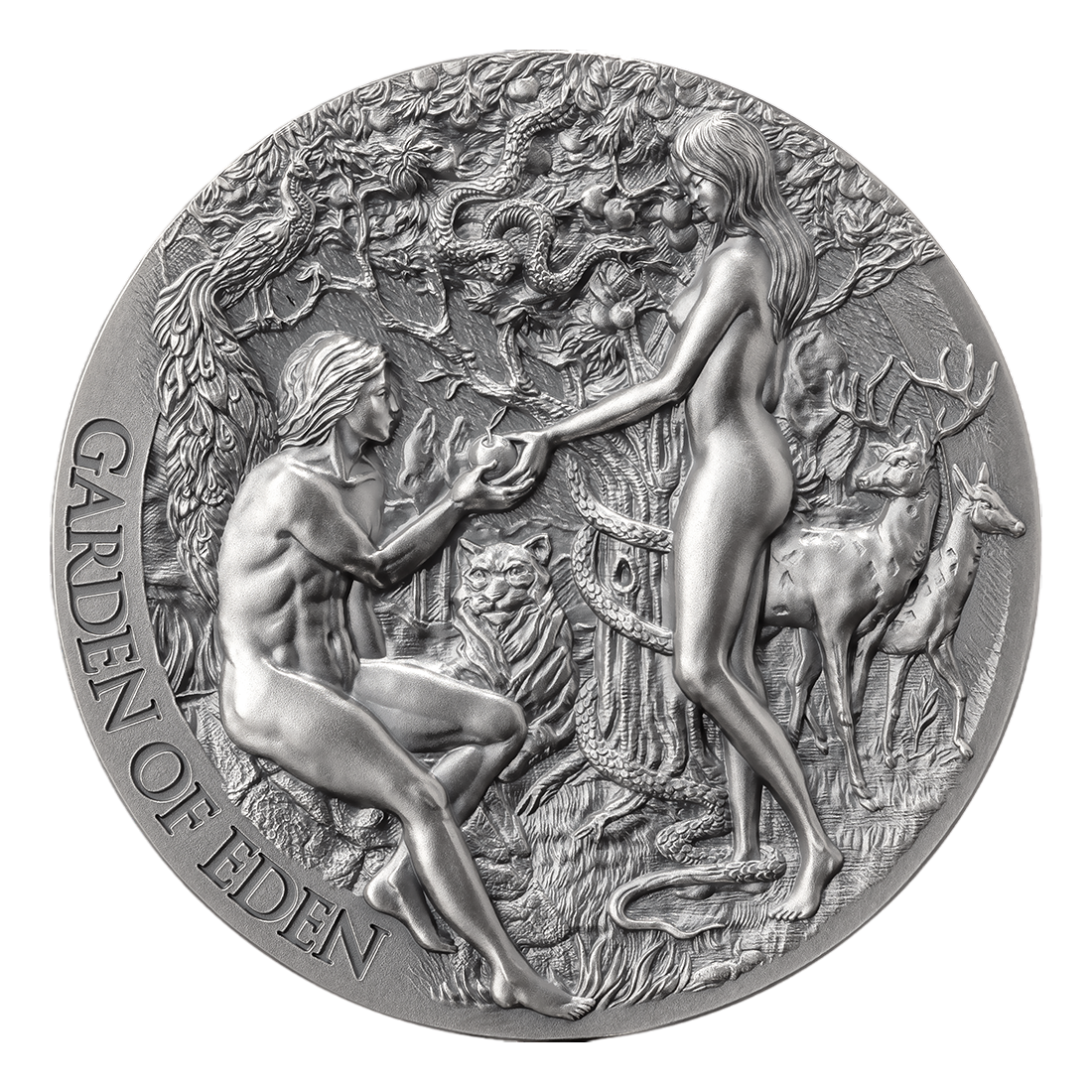 The coin depicts one of the most important motifs of culture and spirituality – the Garden of Eden, rooted in biblical narrative as a place of beginnings and a symbol of pristine beauty. At the center of the composition is the tree of knowledge, which symbolizes choice and its consequences. This is a universal theme, provoking reflection, while also being visually attractive – an ideal starting point for investors interested in valuable numismatic content.