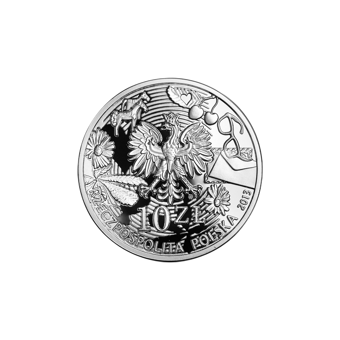 The reverse of the coin depicts the eagle established for the emblem of the Republic of Poland. Below the eagle is the inscription "10 ZŁ," and at the bottom "REPUBLIC OF POLAND 2013." Around the eagle are objects referring to the lyrics of Agnieszka Osiecka's songs: figurines of two horses, a heart, daisy flowers, chestnut leaves, cherries, a leaf with a heart image, glasses, two envelopes. In the background are circles symbolizing a vinyl record. The designer of the reverse was also Dobrochna Surajewska.