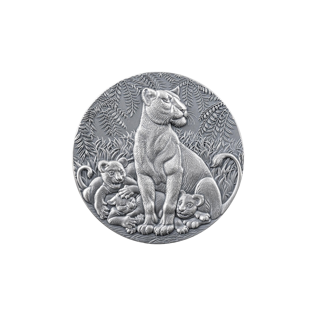 The coin's design depicts a dramatic yet symbolic scene of the grand hunting. The dynamic composition presents predators chasing their prey against the backdrop of the savannah – lions, leopards, and antelopes in motion, captured in a realistic style and high relief. The scene reflects the natural order of life – birth, survival, and death – all enclosed in the single circle of nature. The details have been refined with extraordinary precision, and thanks to the use of hand-polishing techniques, each element has three-dimensional depth and clarity.
