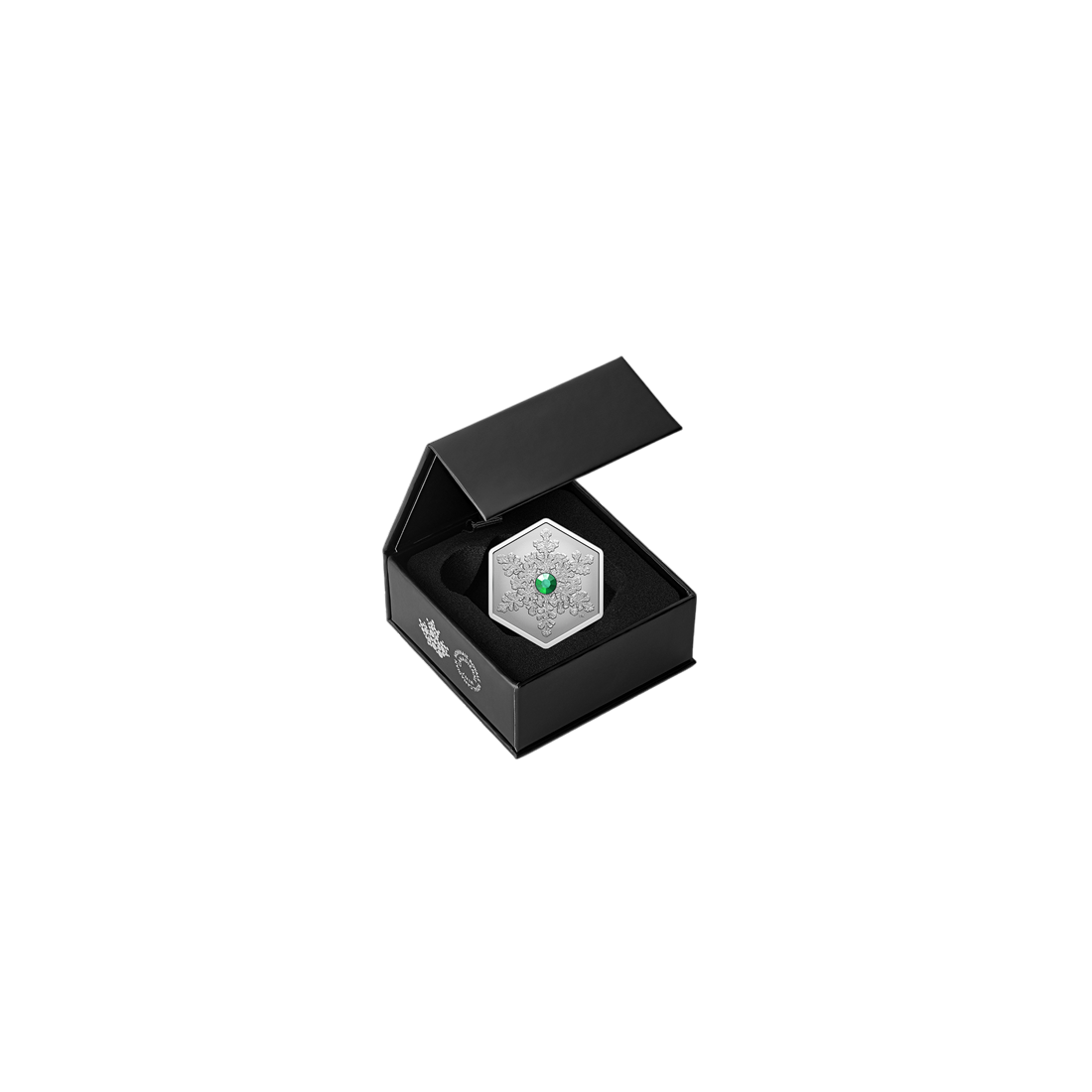 A hexagonal coin made of pure silver, depicting a crystal snowflake. It is an intricately engraved design, inspired by the classic crystal of star-shaped snow dendrites. In the center of the coin is a light blue crystal, reminiscent of the glow of freshly fallen snow. The coin weighs 1 ounce, with a mintage of 7,500 pieces, and is delivered in a display box, along with a certificate of authenticity. It is the second coin in the Snowflake series.