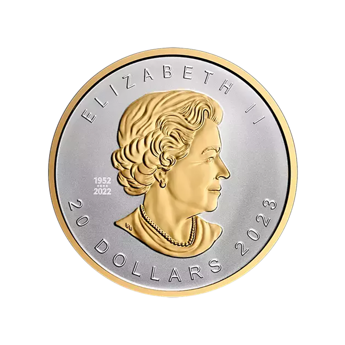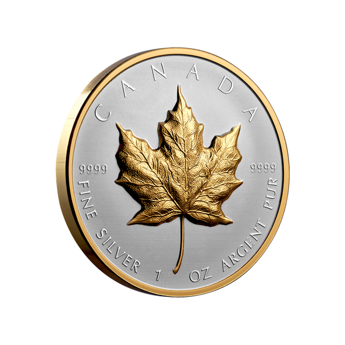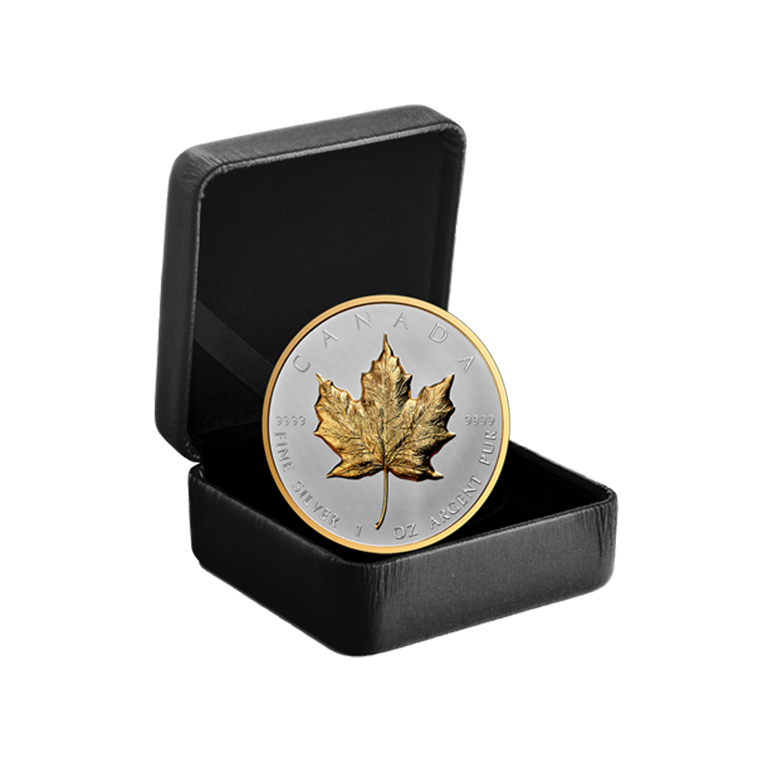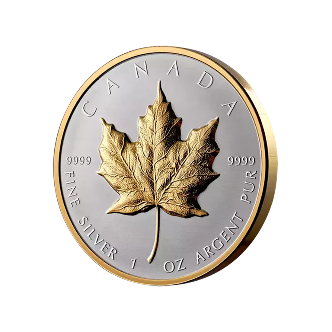 It is also worth noting the exceptional design of the 1 oz 2023 Ultra High Relief Maple Leaf Silver Coin - 24h Shipping!. On the reverse, we can admire a gilded maple leaf on a matte silver background. This iconic leaf is struck in ultra-high relief, meaning the reliefs are significantly higher than on most other coins. Additionally, around the leaf, there are inscriptions "CANADA," "FINE SILVER 1 OZ OR ARGENT PUR," and the metal purity "9999," confirming the highest quality of the material.