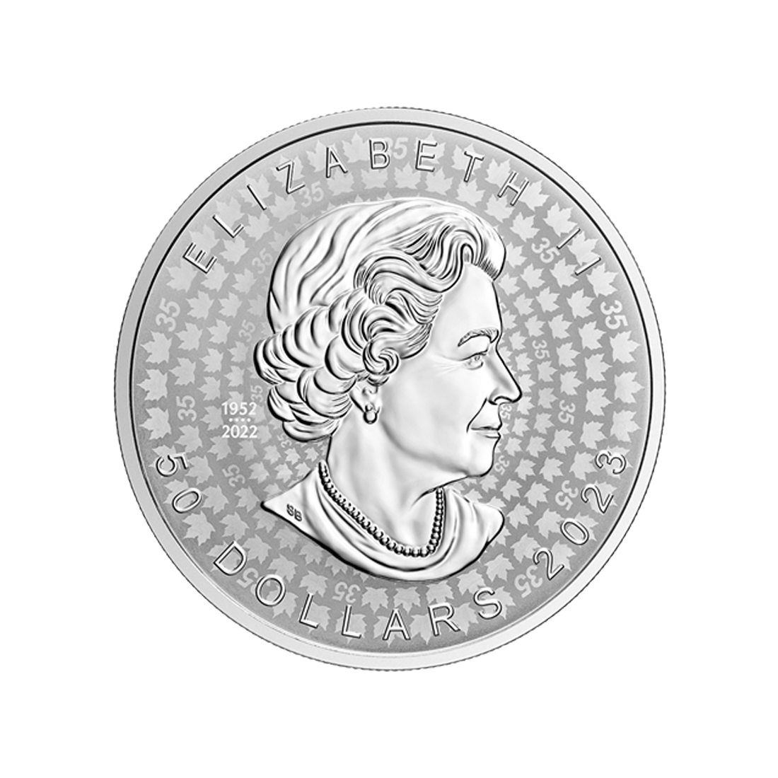 The obverse of the coin is adorned with the image of Queen Elizabeth II by Susanna Blunt, set against a background of maple leaves – the pattern from the reverse is repeated. It also includes the inscription "ELIZABETH II" and the years of the queen's reign "1952 – 2022", as well as the denomination "50 DOLLARS" and the year of issue "2023".