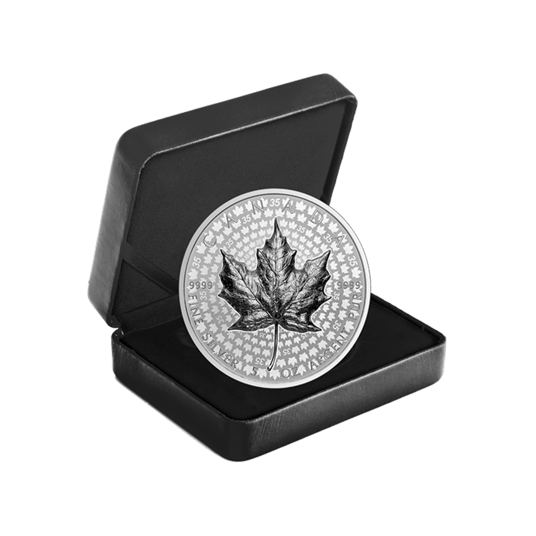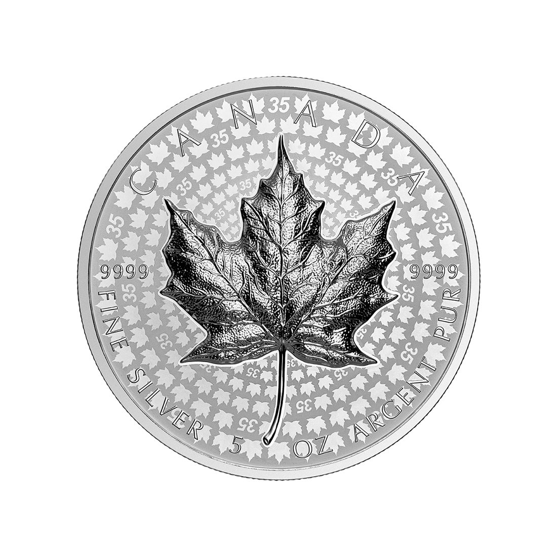 On the reverse of the coin, in the central point, the iconic maple leaf is placed, crafted using Ultra High Relief technology, providing greater relief than regular coins. The matte background is noteworthy – it consists of concentrically arranged circles made of small maple leaves, among which the number "35" is placed. The reverse features the inscriptions "CANADA", "FINE SILVER 5 OZ ARGENT PUR", and the silver purity "9999".