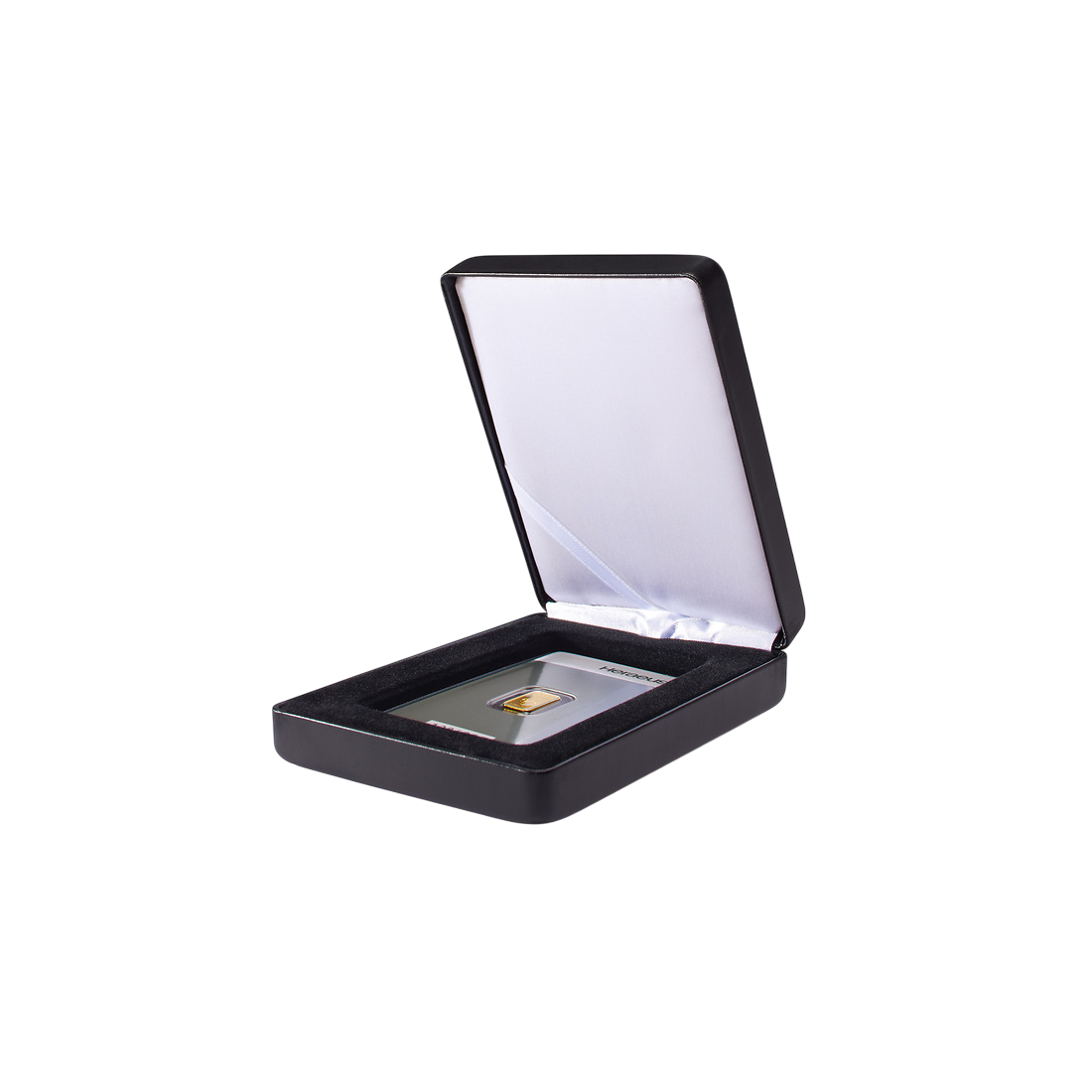 Etui Nobile wyróżnia się wyjątkową estetyką i dbałością o każdy detal. Z zewnątrz zostało pokryte wysokiej jakości materiałem, który doskonale imituje skórę, nadając mu luksusowy i profesjonalny wygląd. Głęboka czerń obicia idealnie kontrastuje z połyskiem szlachetnego kruszcu, tworząc imponującą kompozycję. Wnętrze etui wyściełane jest miękkim, czarnym aksamitem, który działa jak poduszka, delikatnie otulając blister ze sztabką i zapobiegając jej przesuwaniu się. To rozwiązanie jest dowodem na to, że nawet akcesoria do przechowywania inwestycji mogą być dziełem sztuki użytkowej.