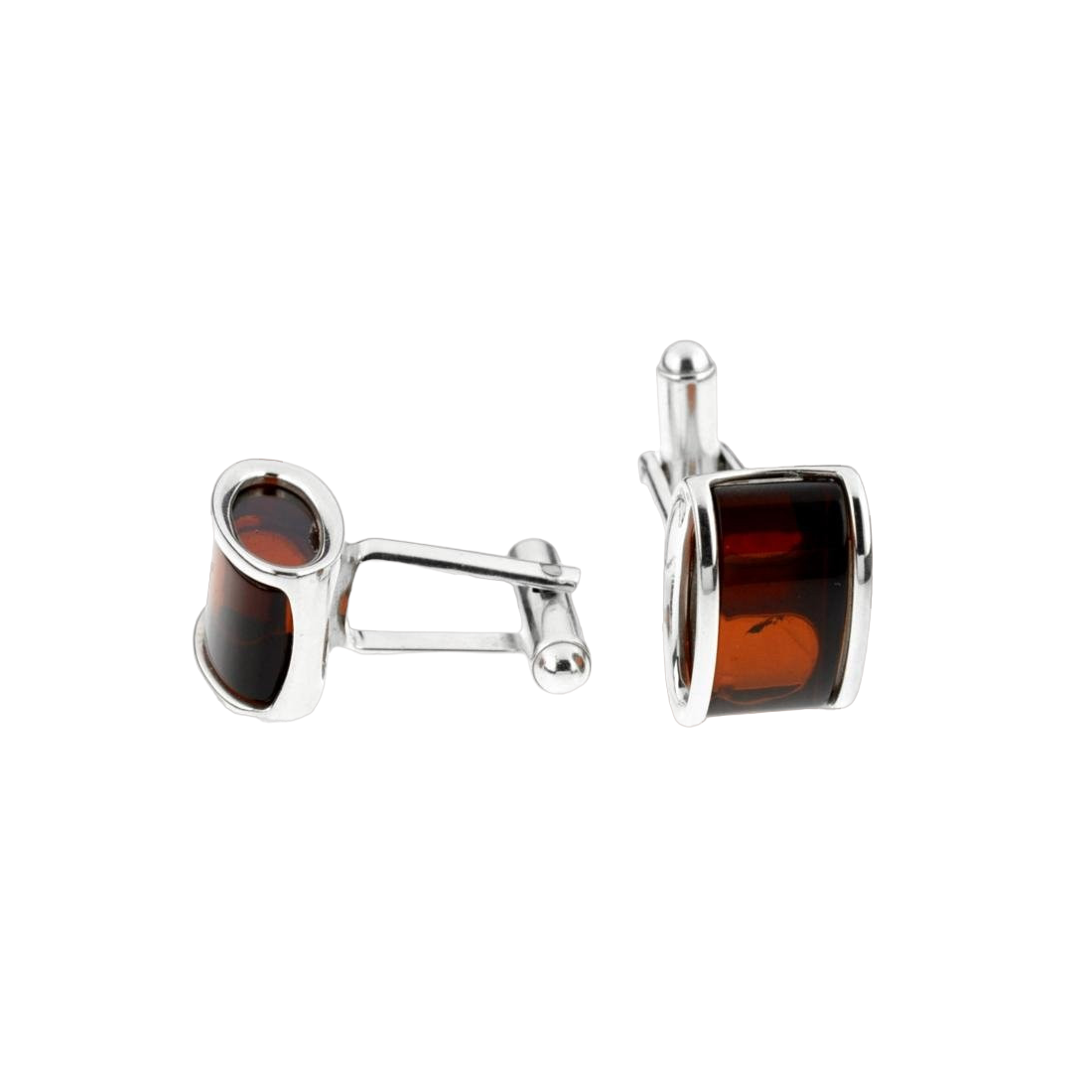 Spinki do mankietów wykonane w całości ze srebra pokrytego szlachetnym rodem zabezpieczającym przed czernieniem z naturalnymi certyfikowanymi bursztynami bałtyckimi w kolorze szlachetnej wiśni.
