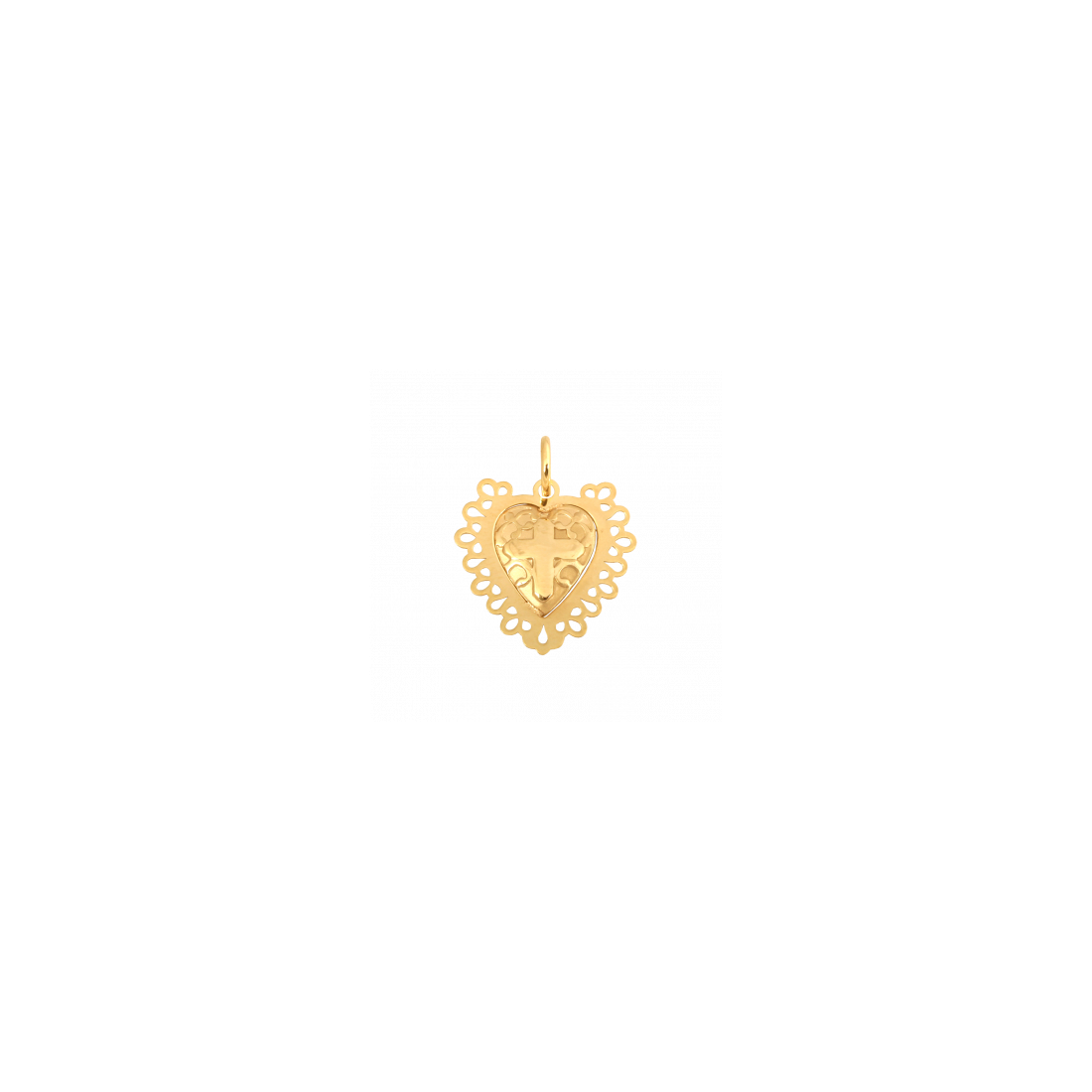 Śliczny medalik serce z wizerunkiem krzyża otoczony ażurową ramką, wykonany w całości ze złota o próbie 0,585 / 14 karatów.