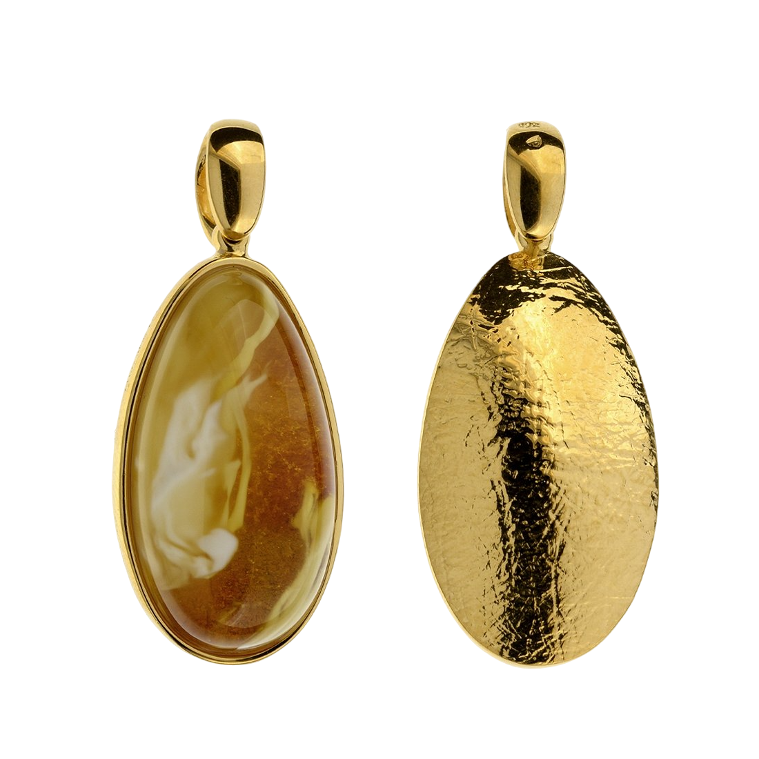 Unikatowy wisiorek wykonany w całości z pozłacanego srebra próby 925 z naturalnym certyfikowanym bursztynem bałtyckim w kolorze miodowo mlecznym.