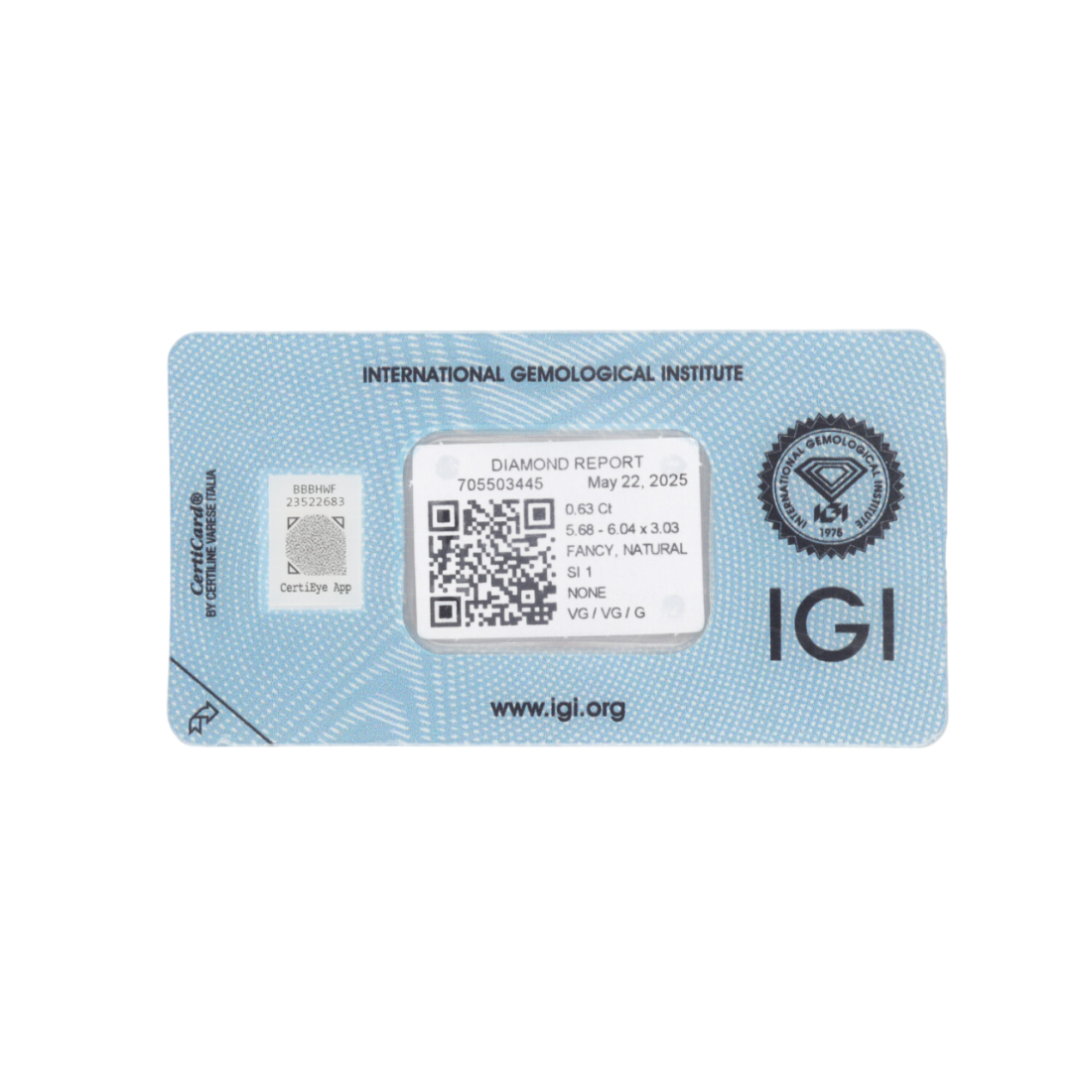 Każdy diament posiada certyfikat, zapewniający o autentyczności i rzetelnych parametrach kamienia. Dokumenty pochodzą z jednego z niezależnych, renomowanych laboratoriów gemmologicznych – GIA (Gemological Institute of America), IGI (International Gemological Institute) lub HRD (Hoge Raad voor Diamant). Są to jedne z najbardziej uznawanych dokumentów potwierdzających autentyczność i jakość diamentów, według międzynarodowych standardów.