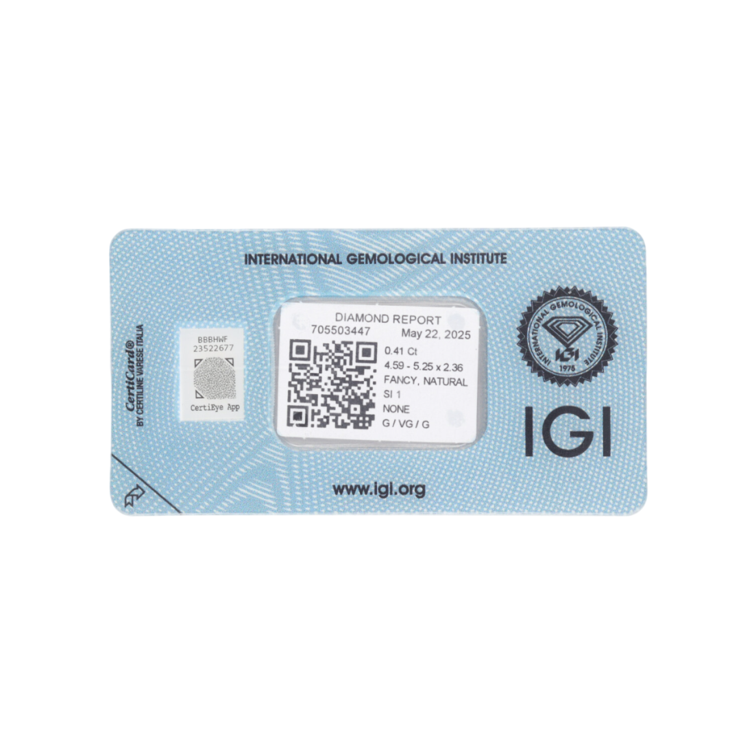Każdy diament posiada certyfikat, zapewniający o autentyczności i rzetelnych parametrach kamienia. Dokumenty pochodzą z jednego z niezależnych, renomowanych laboratoriów gemmologicznych – GIA (Gemological Institute of America), IGI (International Gemological Institute) lub HRD (Hoge Raad voor Diamant). Są to jedne z najbardziej uznawanych dokumentów potwierdzających autentyczność i jakość diamentów, według międzynarodowych standardów.