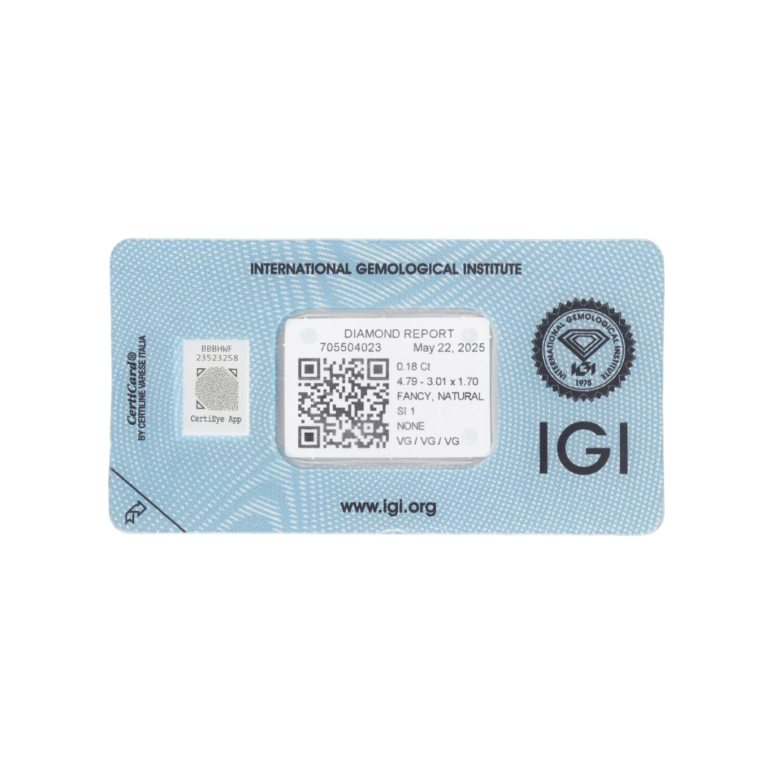 Każdy diament posiada certyfikat, zapewniający o autentyczności i rzetelnych parametrach kamienia. Dokumenty pochodzą z jednego z niezależnych, renomowanych laboratoriów gemmologicznych – GIA (Gemological Institute of America), IGI (International Gemological Institute) lub HRD (Hoge Raad voor Diamant). Są to jedne z najbardziej uznawanych dokumentów potwierdzających autentyczność i jakość diamentów, według międzynarodowych standardów.