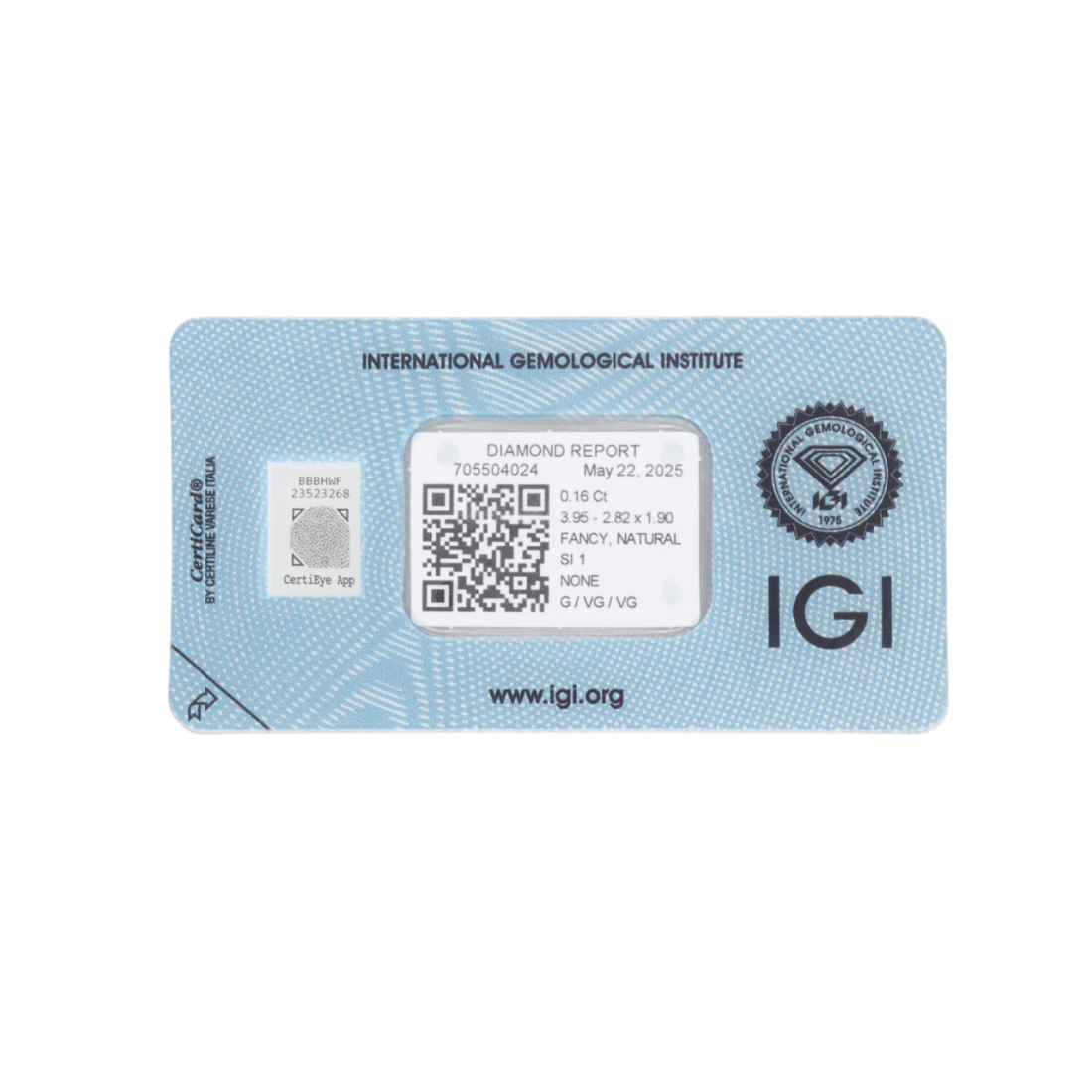 Każdy diament posiada certyfikat, zapewniający o autentyczności i rzetelnych parametrach kamienia. Dokumenty pochodzą z jednego z niezależnych, renomowanych laboratoriów gemmologicznych – GIA (Gemological Institute of America), IGI (International Gemological Institute) lub HRD (Hoge Raad voor Diamant). Są to jedne z najbardziej uznawanych dokumentów potwierdzających autentyczność i jakość diamentów, według międzynarodowych standardów.