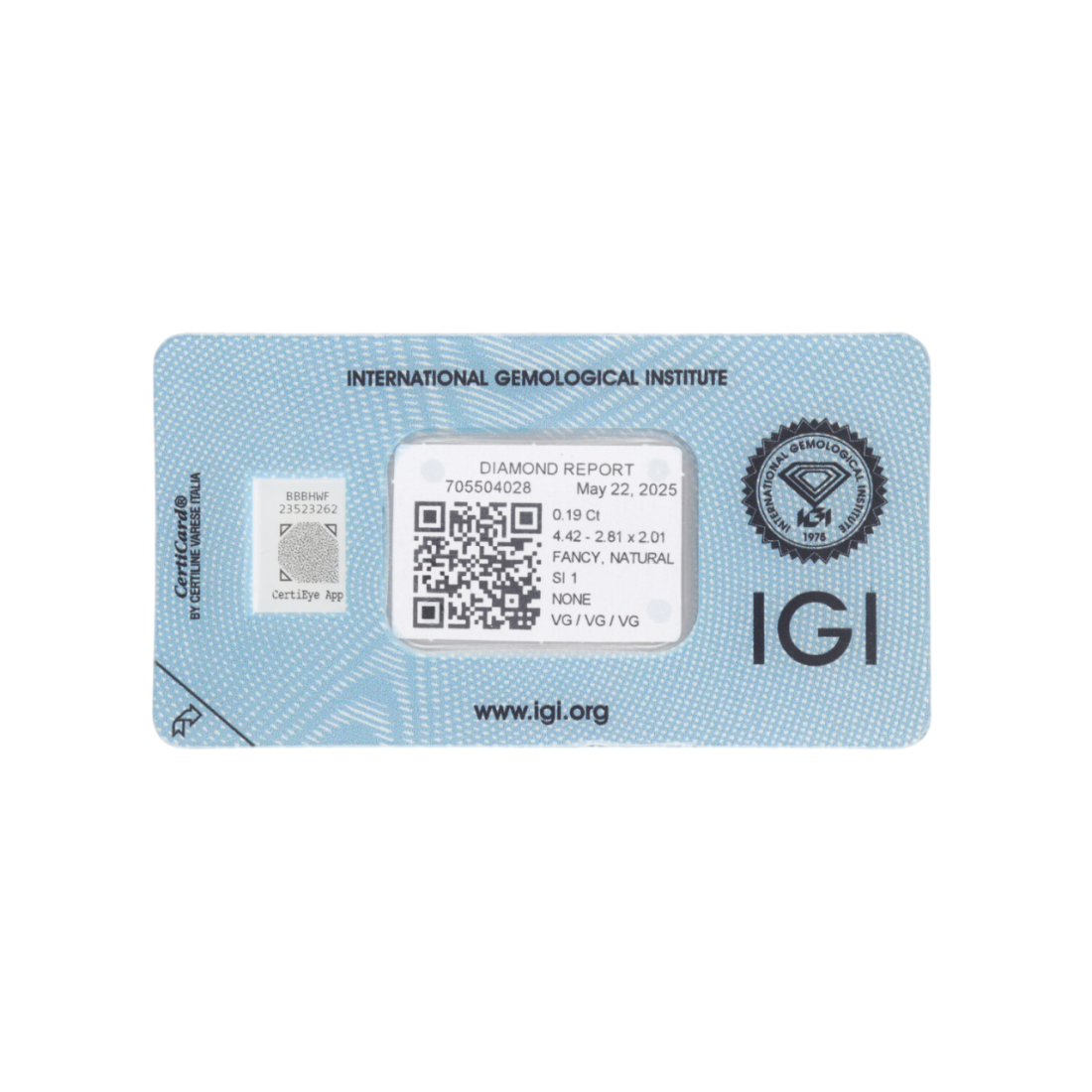 Każdy diament posiada certyfikat, zapewniający o autentyczności i rzetelnych parametrach kamienia. Dokumenty pochodzą z jednego z niezależnych, renomowanych laboratoriów gemmologicznych – GIA (Gemological Institute of America), IGI (International Gemological Institute) lub HRD (Hoge Raad voor Diamant). Są to jedne z najbardziej uznawanych dokumentów potwierdzających autentyczność i jakość diamentów, według międzynarodowych standardów.