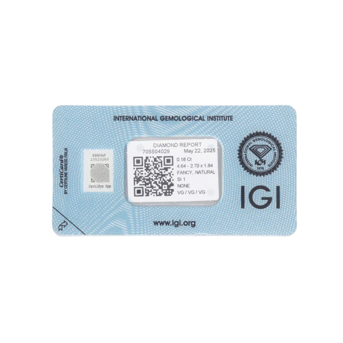 Każdy diament posiada certyfikat, zapewniający o autentyczności i rzetelnych parametrach kamienia. Dokumenty pochodzą z jednego z niezależnych, renomowanych laboratoriów gemmologicznych – GIA (Gemological Institute of America), IGI (International Gemological Institute) lub HRD (Hoge Raad voor Diamant). Są to jedne z najbardziej uznawanych dokumentów potwierdzających autentyczność i jakość diamentów, według międzynarodowych standardów.