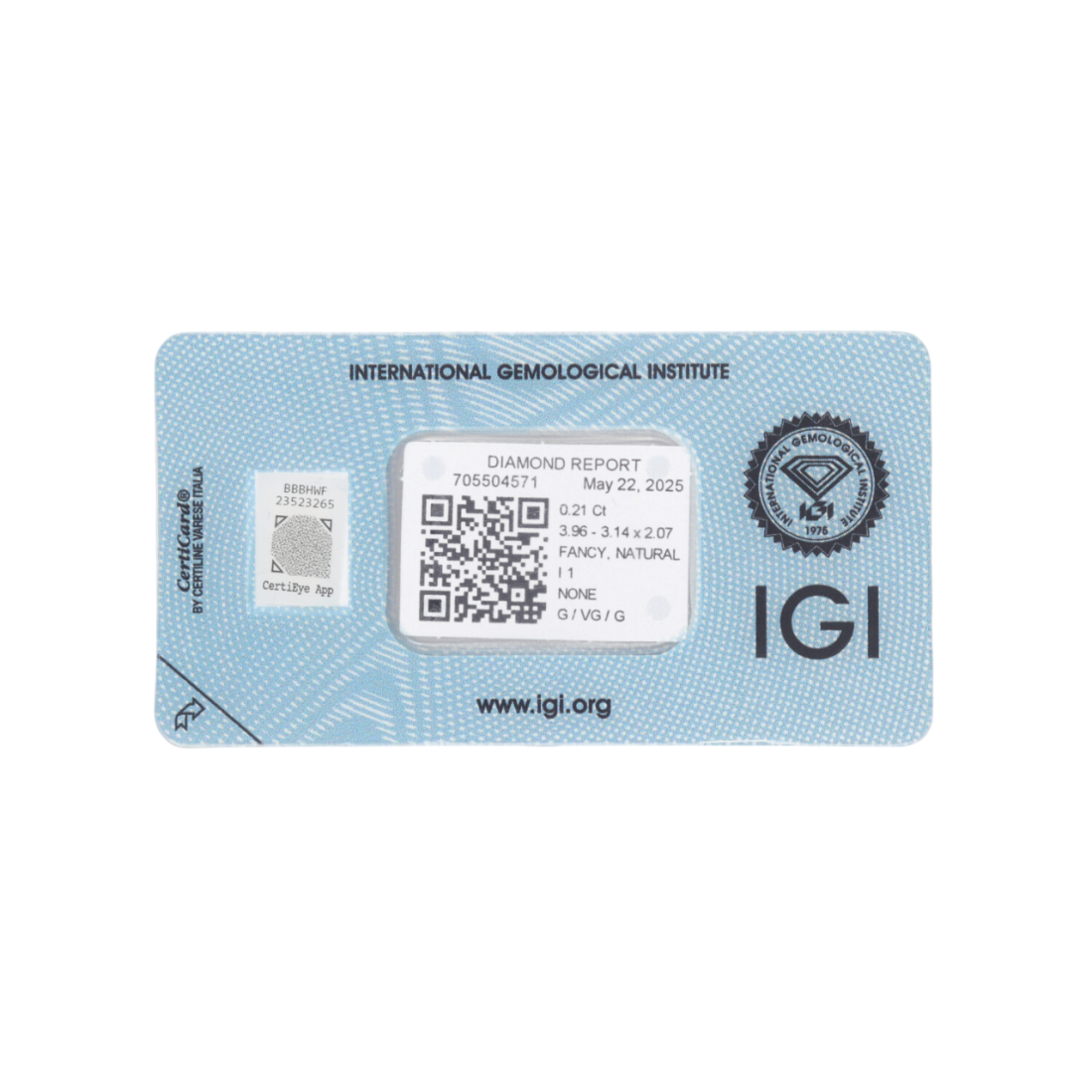 Każdy diament posiada certyfikat, zapewniający o autentyczności i rzetelnych parametrach kamienia. Dokumenty pochodzą z jednego z niezależnych, renomowanych laboratoriów gemmologicznych – GIA (Gemological Institute of America), IGI (International Gemological Institute) lub HRD (Hoge Raad voor Diamant). Są to jedne z najbardziej uznawanych dokumentów potwierdzających autentyczność i jakość diamentów, według międzynarodowych standardów.