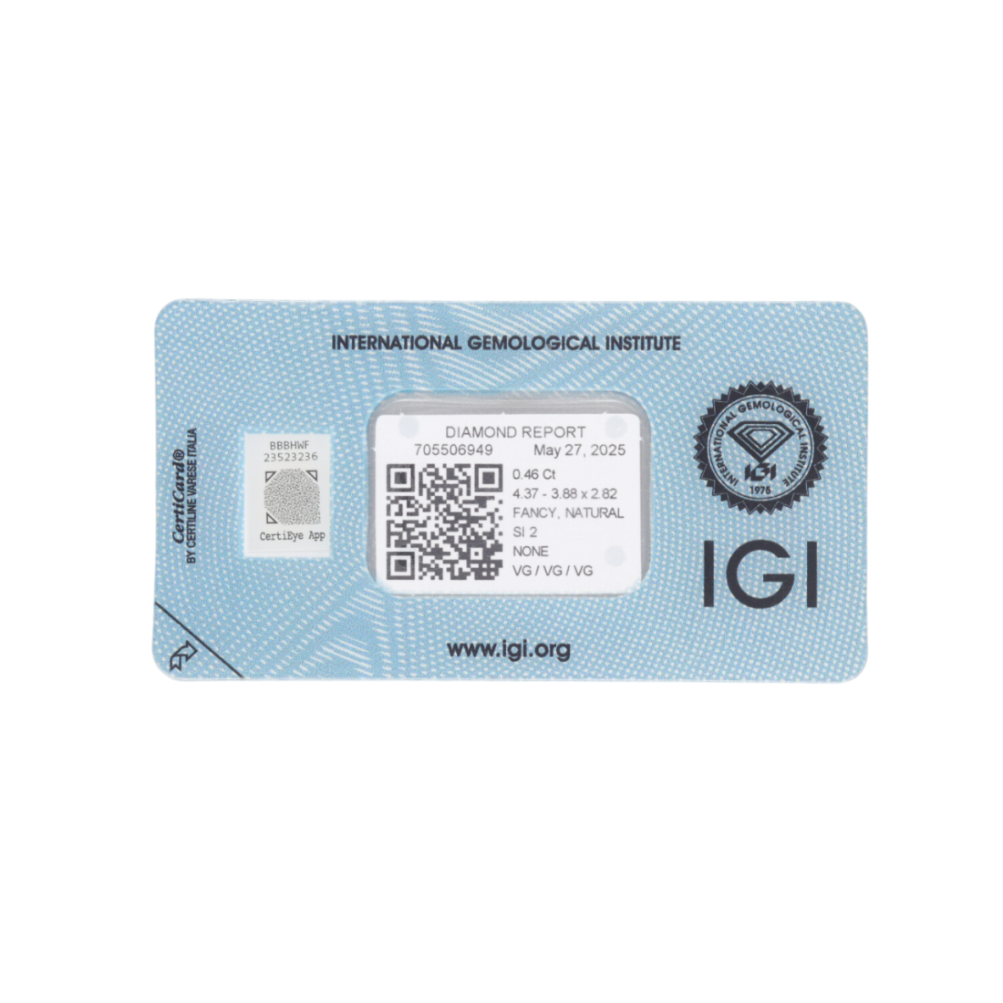 Każdy diament posiada certyfikat, zapewniający o autentyczności i rzetelnych parametrach kamienia. Dokumenty pochodzą z jednego z niezależnych, renomowanych laboratoriów gemmologicznych – GIA (Gemological Institute of America), IGI (International Gemological Institute) lub HRD (Hoge Raad voor Diamant). Są to jedne z najbardziej uznawanych dokumentów potwierdzających autentyczność i jakość diamentów, według międzynarodowych standardów.