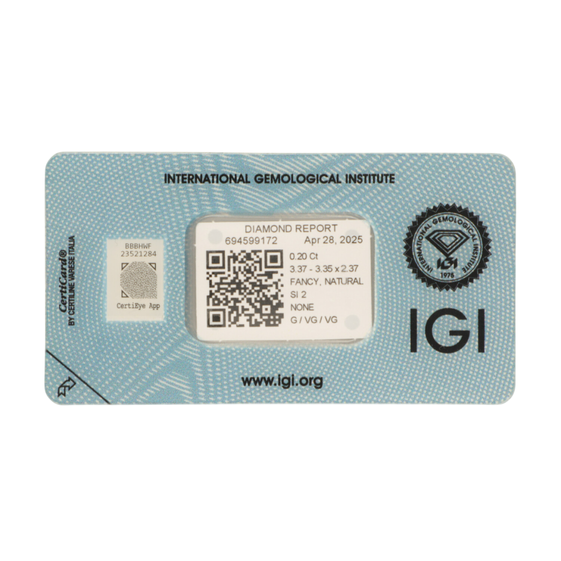 Każdy diament posiada certyfikat, zapewniający o autentyczności i rzetelnych parametrach kamienia. Dokumenty pochodzą z jednego z niezależnych, renomowanych laboratoriów gemmologicznych – GIA (Gemological Institute of America), IGI (International Gemological Institute) lub HRD (Hoge Raad voor Diamant). Są to jedne z najbardziej uznawanych dokumentów potwierdzających autentyczność i jakość diamentów, według międzynarodowych standardów.