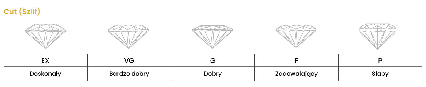 4. Szlifie (Cut) – mowa o proporcji, symetrii oraz polerancji diamentu. Nie jest to zatem parametr odnosz? cy się do kształtu, ale do interakcji diamentu na padaj? ce na jego powierzchnię światło!