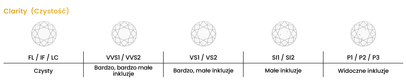 3. Czystości (Clarity) – diamenty mog? zawierać niewielkie niedoskonałości, a ich poziom określa skala czystości. Kamienie niemalże pozbawione skaz, zwane s? „Internally Flawless” IF. Te z dużymi skazami określa się mianem „Imperfect” P1, P2, P3.