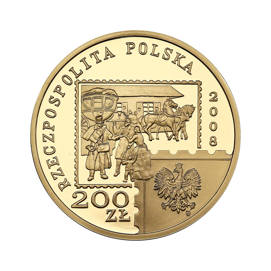 Awers monety prezentuje z prawej strony wizerunek orła, symbolu Rzeczypospolitej Polskiej, umieszczonego na tle fragmentu znaczka pocztowego. Centralnym punktem jest stylizowany znaczek pocztowy, przedstawiający scenę zmiany koni na stacji pocztowej - moment kluczowy w historii poczty. Napis "200/ZŁ" umieszczony u dołu, a także "RZECZPOSPOLITA POLSKA" w półkolistej formie u góry i po lewej stronie dodają elegancji. Pionowe oznaczenie roku emisji (2008) dopełnia awersu, nadając mu kompleksowości.