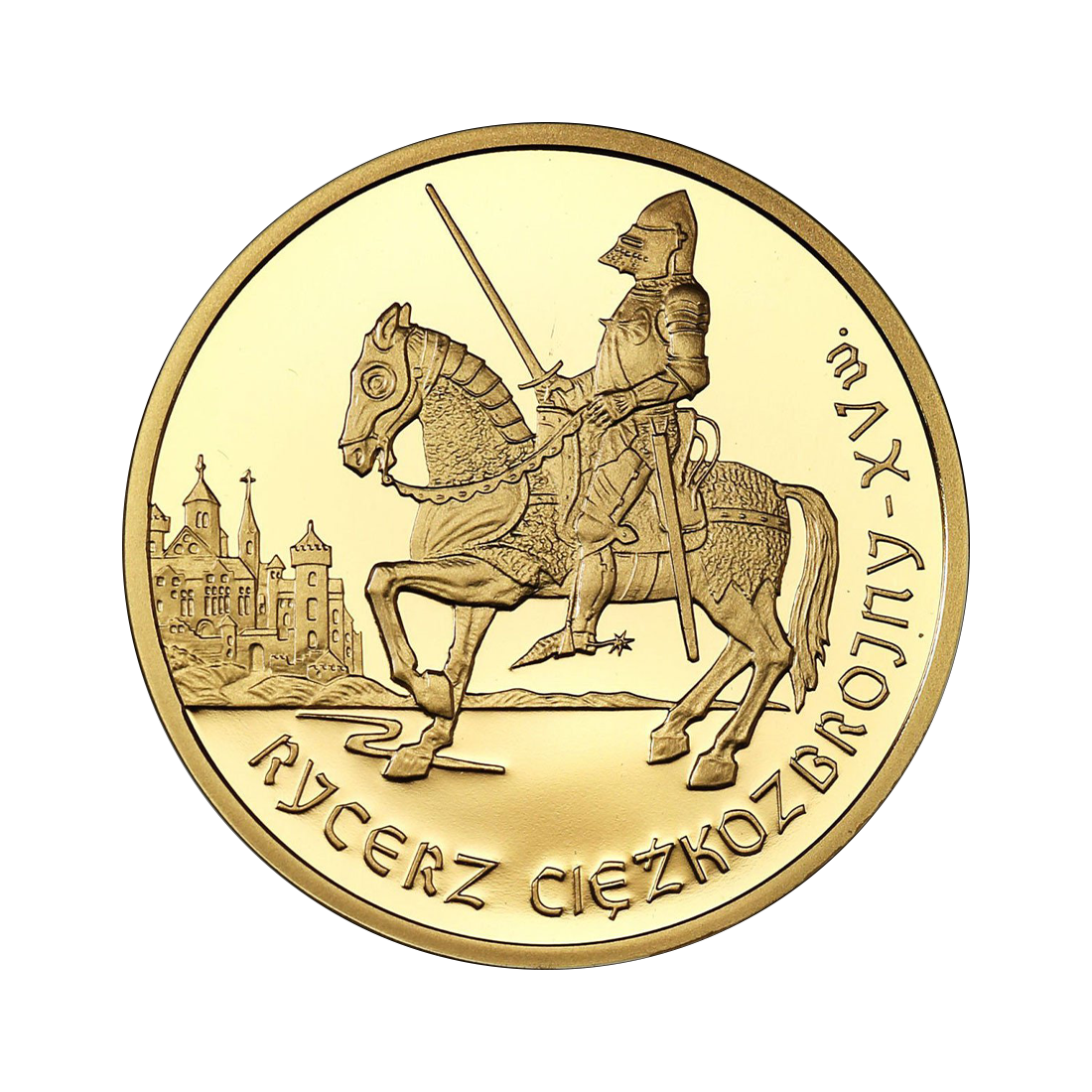 Rewers monety z kolei prezentuje stylizowany wizerunek rycerza ciężkozbrojnego, prowadzącego konia z obnażonym mieczem. Po lewej stronie możemy dostrzec również stylizowany krajobraz zabudowań miejskich. Na dole i z prawej strony rewersu umieszczono napis "RYCERZ CIĘŻKOZBROJNY – XV w.", który podkreśla historyczny kontekst i epokę, w jakiej działał rycerz.